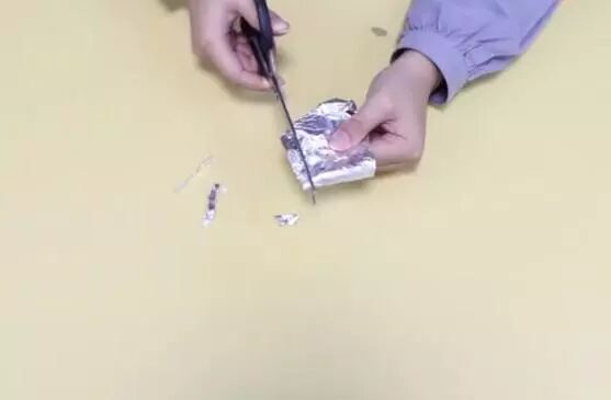 接著我們準備一塊錫箔紙,用剪刀剪它,剪刀在剪的過程當中等於打磨剪刀,頑固的鐵鏽都能磨去,這樣剪完之後剪刀就變得非常鋒利啦,效果非常好,大家抓緊也來試一下吧。