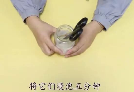 將它們浸泡五分鐘,時間到 ,我們將剪刀給拿出來,然後用乾淨的抹布擦拭乾淨,大家看上面的鏽跡是不是比剛才乾淨多了呢,而且已經變得光亮如新啦;