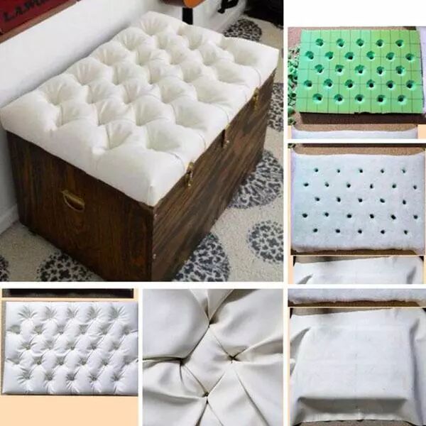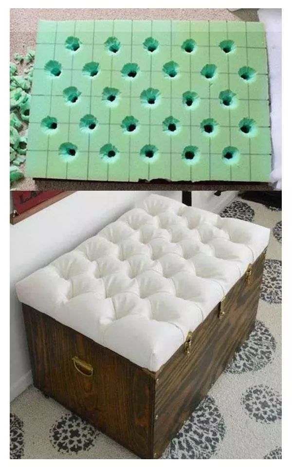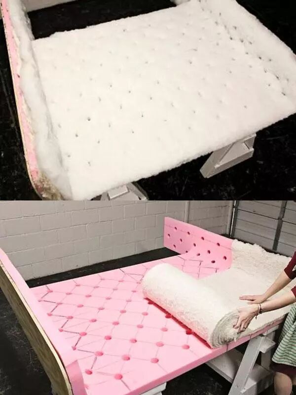 選擇自己不用的床單、舊窗簾(只要是布就行),鋪在海綿墊上,切記事先一定要先量好海綿墊的尺寸,保證鋪在上面的布能包住海綿墊,接著就可以按照挖好的洞口進行按壓了,製作出褶皺的效果。
