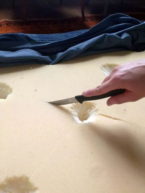 畢竟是使用以前的海綿墊,又經過挖洞的處理,海綿墊變得更加薄了,為保證製作出的海綿墊使用更長久點,可以在上面鋪一層棉絮(舊棉衣裡的棉絮就可以),當然在棉絮上也要挖洞,不過洞口要比下面的海綿要小一點。