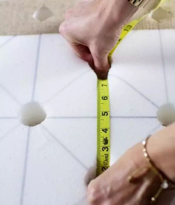 去掉原本的沙發套,留下里面的海綿,因為我想要添加紐扣在裡面,於是要事先用皮尺量好距離,再用記號筆在海綿上進行畫線。
