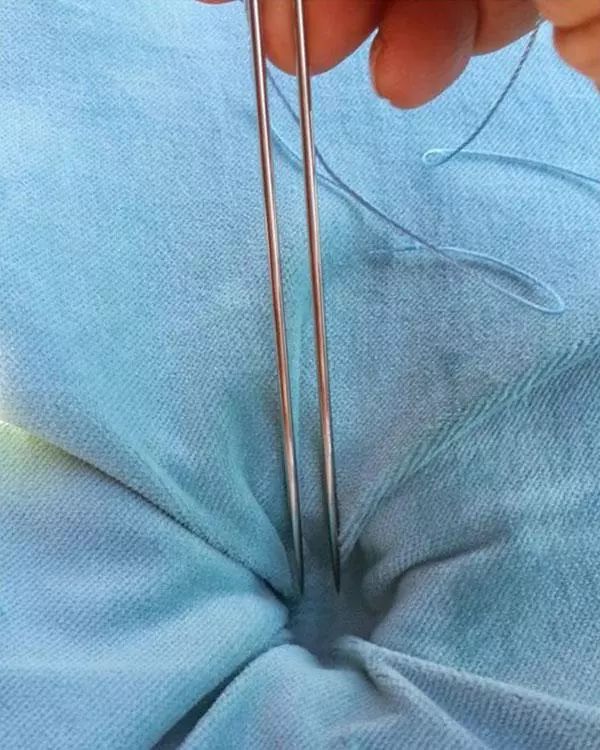 用針線穿過紐扣,再將紐扣釘在挖好的洞口位置,以及沙發墊邊緣的縫合,可以從裁縫店專門借來縫合邊緣線的工具。