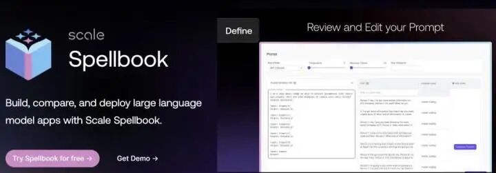 目前在Scale AI官網展示的眾多業務中,可以找到一項針對大語言模型的新業務Spellbook(魔法書)。簡單說,它能自動推薦、儲存、管理合適的提示詞,比較同一提示詞在不同模型下的效果,並結合其他服務部署上線AI應用。