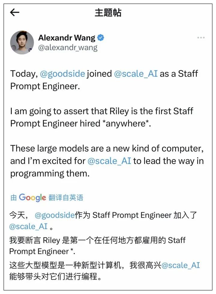 他的老闆也在推特上解釋了聘用原因:“AI大模型可以看成是一種新型計算機,所以需要一種新型程序員去為它編程。”