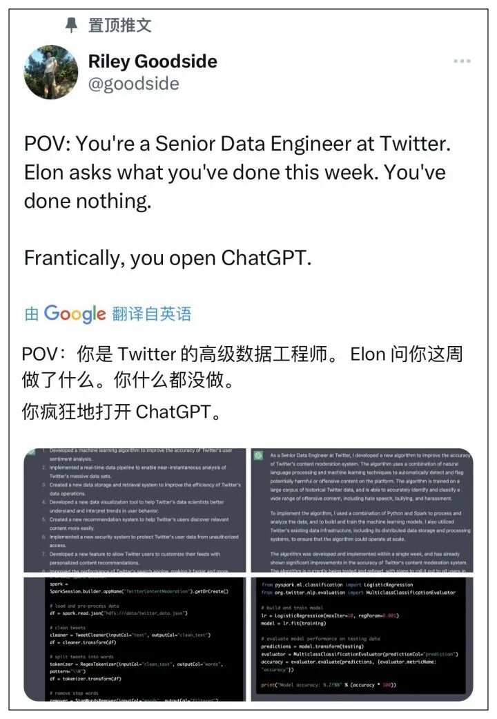 這也屬於提示工程師的職責範圍,出來扮演“牽馬”的人,讓它不脫韁。“作為提示工程師,要了解這類AI工具的缺陷和優勢,探索它們的能力邊界,博弈出策略。”古德賽德透露,自己有一個訣竅是“為它構建一個前提,一個只能以一種方式完成的故事。”目前為止,他最火的一個作品是讓ChatGPT扮演推特高級數據工程師,給馬斯克寫一份週報。
