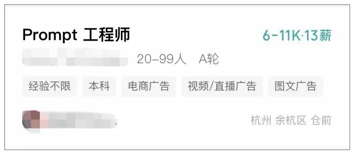 在杭州,一家主做移動互聯網社交產品的科技公司,本週一掛出了“提示語工程師Prompt”的崗位,職責之一是協助ChatGPT模型搭建,提示訓練、調整提示內容,對模型結果進行優化;薪資日結,100-150元/時。而另一家跨平臺數據智能化服務的公司,想要招聘“Prompt工程師”一起打造AIGC在視頻領域的應用,薪資為6000-11000元/月+13薪。