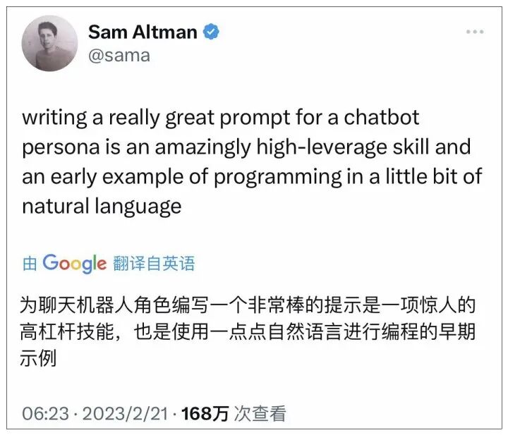 OpenAI的首席執行官山姆·阿爾特曼在社交平臺上說:“為聊天機器人編寫一條優質的提示是一項驚人的高級技能,也是自然語言編程的早期示例。”
