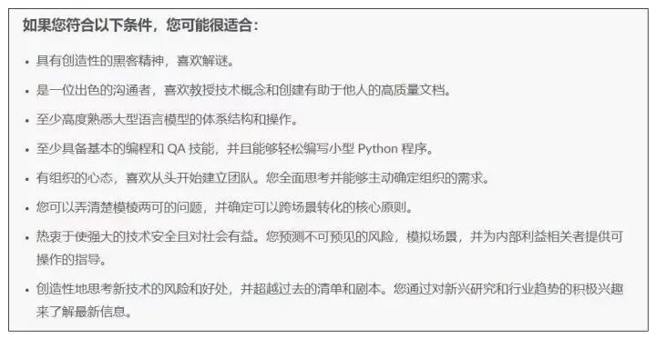 對申請者提出了8個條件,看上去比較硬槓槓的是:熟悉大型語言模型的架構和操作;具備基本的編程和QA(質量保證)技能。