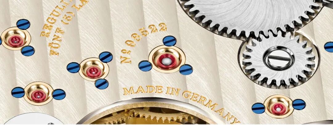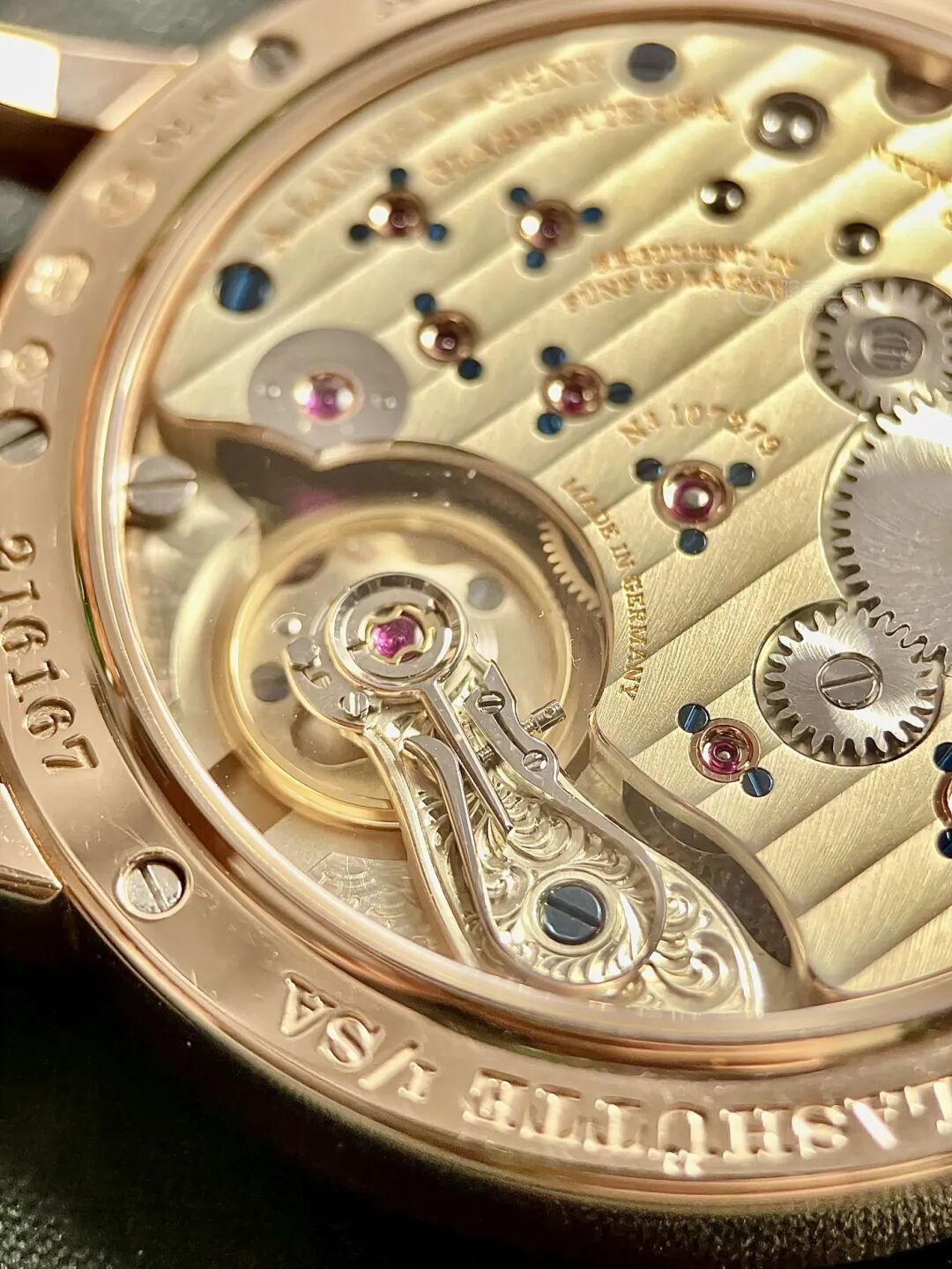 當我把這隻1815 UP/DOWN遞給並不那麼熟悉腕錶的朋友,他們往往會誇一誇錶盤設計的對稱精緻、棕色牛皮錶帶的百搭不沉悶、或是藍鋼針在光線下跳動的活潑色澤。但當我請朋友們把表翻到背面,那塊均勻氧化出白葡萄酒色澤的四分之三夾板、對比強烈的紅-金-藍三原色(軸承-套筒-螺絲)、以及“螺螄殼裡做道場”的雕花鵝頸,總能收穫到異口同聲的:wow!