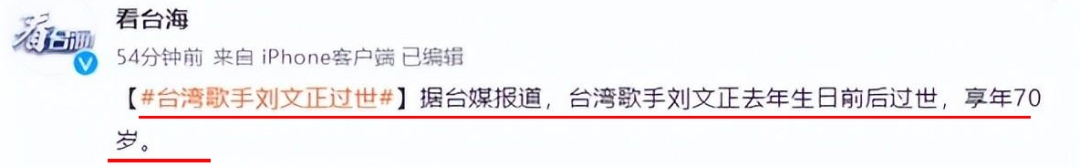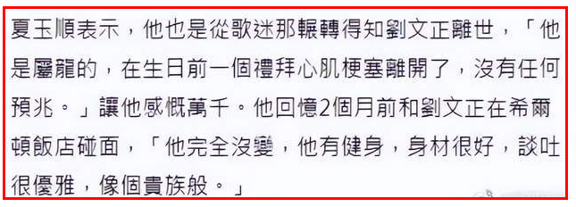 前天台灣資深經紀人夏玉順突然爆出猛料,稱退圈多年的歌壇巨星劉文正幾個月前悄悄去世,死因是獨居在家突發心肌梗塞,享年70歲。