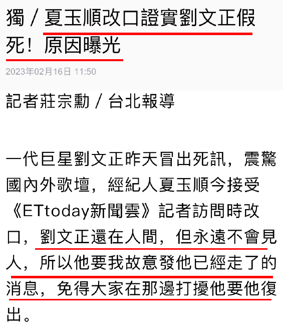 這回夏玉順慫了,改口稱“劉文正確實沒死”,然後又給了個說法說是“劉文正授意他放出死訊,希望杜絕大家求他復出的念頭”。