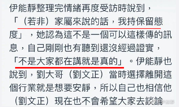 不過伊能靜還比較有理智,哭完冷靜下來又表示自己之前沒聽過這個消息,如果消息不是劉文正親屬發出的,自己保留態度,不是說的人多就是真的。