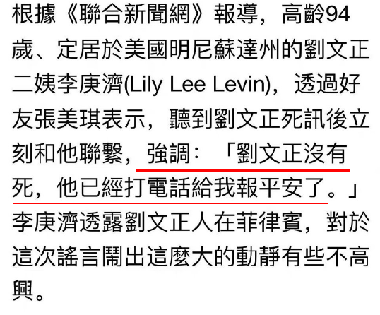 劉文正94歲的親二姨因死訊事件不得不出面親自替侄子闢謠,說事情發生後她趕緊跟侄子聯繫,劉文正也回電話給她報平安,人在菲律賓,身體健康沒問題。