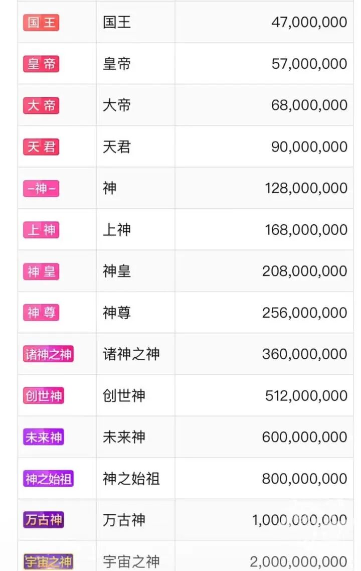 我數了數,一共36個級別,直到達到“萬古神”、“宇宙之神”之後,用戶就可以“自定義神”了。