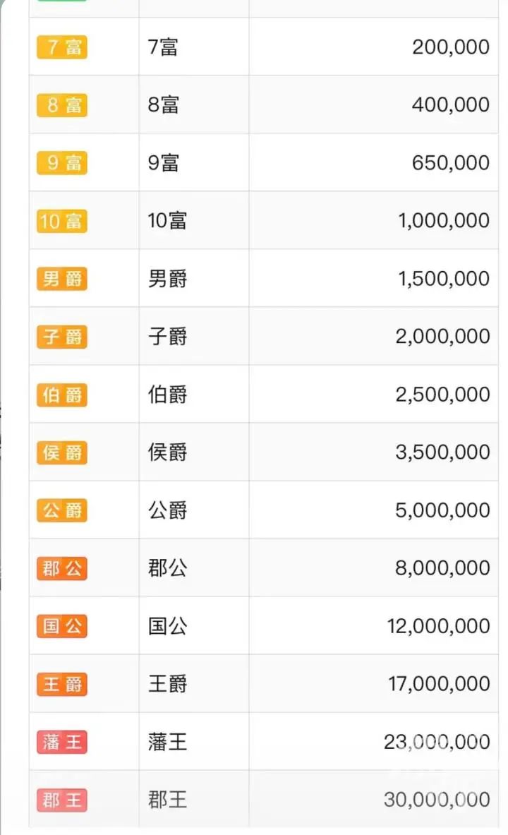 通常,不同的等級名稱也對應了不同的財富等級經驗值,想要成為“藩王”,需要2300萬經驗值,也就是2300萬星幣。