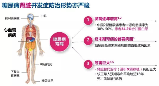 首先,許多腎臟病患者在早期一般不會有特別的臨床症狀,當感到不舒服去就醫時發現很多已經進入到腎病的中期甚至晚期了。據統計,慢性腎臟病的知曉率卻僅為12.5%,因此慢性腎臟病又被稱為“沉默的殺手”。其次,伴隨社會經濟的發展,我國糖尿病患者正在逐年增加,據統計,平均每3個糖尿病患者中就有1個糖尿病腎病患者,在美國糖尿病腎病已成為導致終末期腎病的第一大原因,在我國也已成為僅次於各種腎小球腎炎的第二大原因,尿毒症患者中有1/3左右是由糖腎引起的。由於糖尿病腎病存在複雜的代謝紊亂機制,即使控制住了血糖,仍然會攻擊腎臟,一旦發展到終末期腎臟病,治療起來相較其他腎病更加棘手。況且慢性腎臟病往往病情遷延難愈,一人得病,患者家庭往往揹負沉重負擔。