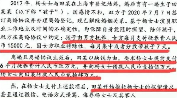離婚後,田亮不知是缺錢還是怎麼,向楊明娜預支了9萬撫養費。