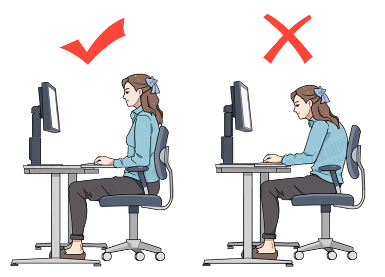 另外,坐在電腦前要端正坐姿,小腿和大腿之間的夾角不小於90°,同時也要避免久坐,最好半小時就站起來活動一下。