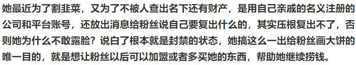 最近在賣衣服那個,她真是把割韭菜發揮的淋漓盡致…她財產不是早就轉移了嘛,除了交罰款以外該轉移的早就轉移了,