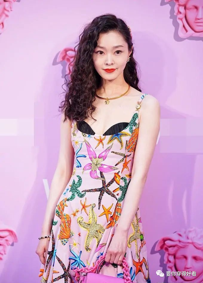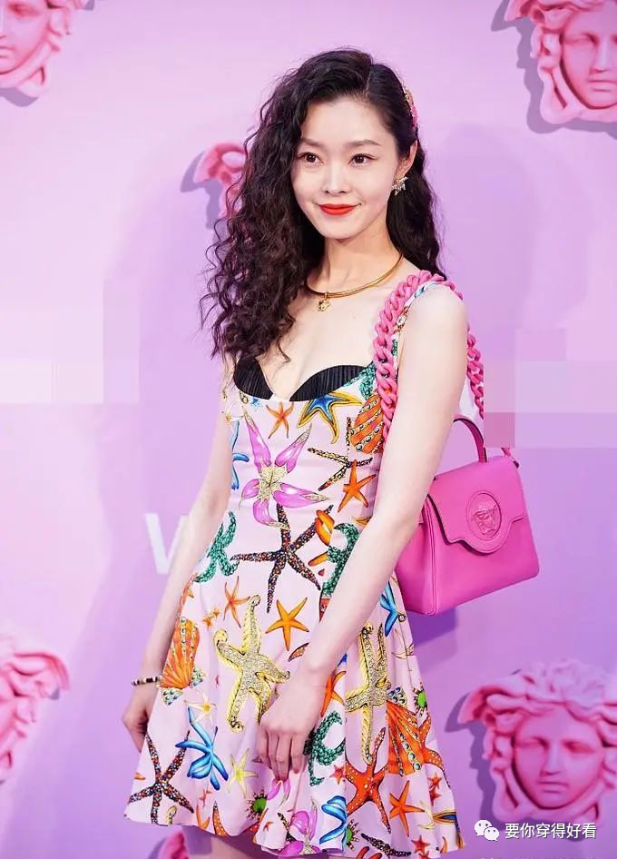 就連吊帶都是彩色系,這樣的裙子包含了春天所有的彩色,宋軼皮膚又很白,穿這種豐富的淺色裙美得驚豔動人。手腕上還有彩色珠子項鍊,黑色內衣露出一小部分,事業線若隱若現,脖子上戴著一款和吉克雋逸一模一樣的金色項圈。宋軼的髮型讓人眼前一亮,蓬鬆的蛋卷散發,嫵媚洋氣,這種髮型襯得宋軼五官精緻臉蛋小巧。