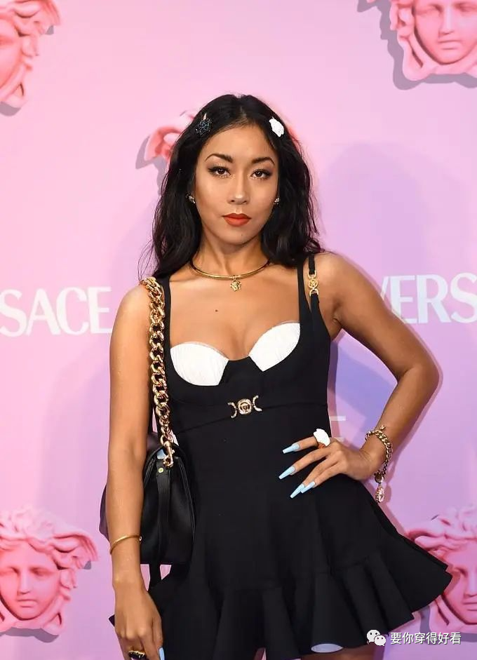 吉克雋逸是經典的“黑美人”,她膚色是少有的小麥色,雖然膚色不是大眾受歡迎的白色,但吉克雋逸五官精緻出眾,膚色黑完全不影響她的美。這次活動穿了一件黑色吊帶短裙,大膽露出了事業線,身材火辣性感,抹胸領口有白色內衣,事業線若隱若現。吊帶加入了鏈條元素,和鏈條包包完美呼應,黑色粗鏈條腋下包時尚百搭,這個季節超受歡迎。