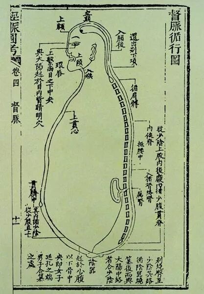 『素門•骨空論』曰:督脈者,起於少腹以下骨中央,女子入系廷孔,其孔溺孔之端也。其絡循陰器,合篡間,繞篡後,別繞臀,至少陰與巨陽中絡者,合少陰上股內後廉,貫脊,屬腎,與太陽起於目內眥,上額,交顛上,入絡腦,還出別下項,循肩髆,內俠脊,抵腰中,入循膂,絡腎。
