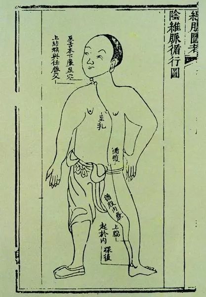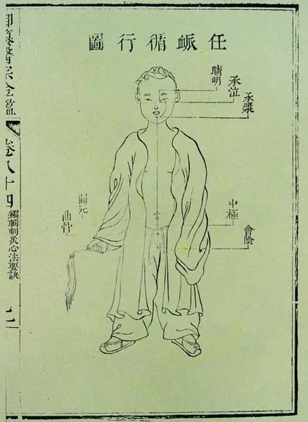 『素問•骨空論』曰:任脈者起於中極之下,以上毛際,循腹裡,上關元,至咽喉上頤,循面入目(見圖七十四)。