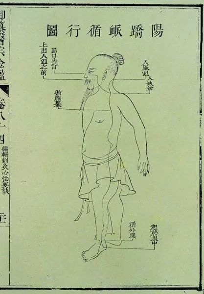 ●陽蹺之脈,起於足跟之中,上合三陽外踝上行,從脅少陽居之穴,上循肩,入頸頄陽明之肩、承泣等穴,屬目內眥而會太陽也。