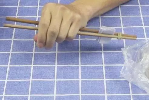 首先我們準備一雙木筷子,然後準備幾根橡皮筋。我們將橡皮筋綁住筷子的尾部,記得要綁緊一些。再拿一張紙將它反覆摺疊幾次,摺好後將其夾到橡皮筋的上面,這樣就完成了。