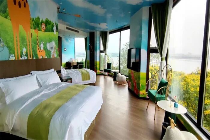 從左至右分別為:海洋主題家庭房、森林主題家庭房、動物主題家庭房、王子主題家庭房、公主主題家庭房