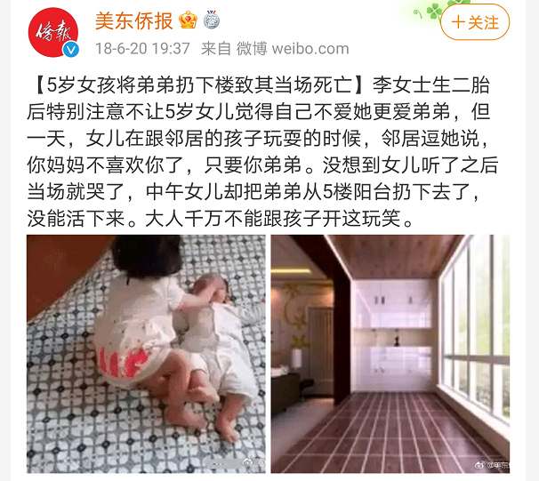 2018年,一位5歲小女孩趁家長不注意,將襁褓中的弟弟扔下樓,致其當場死亡;