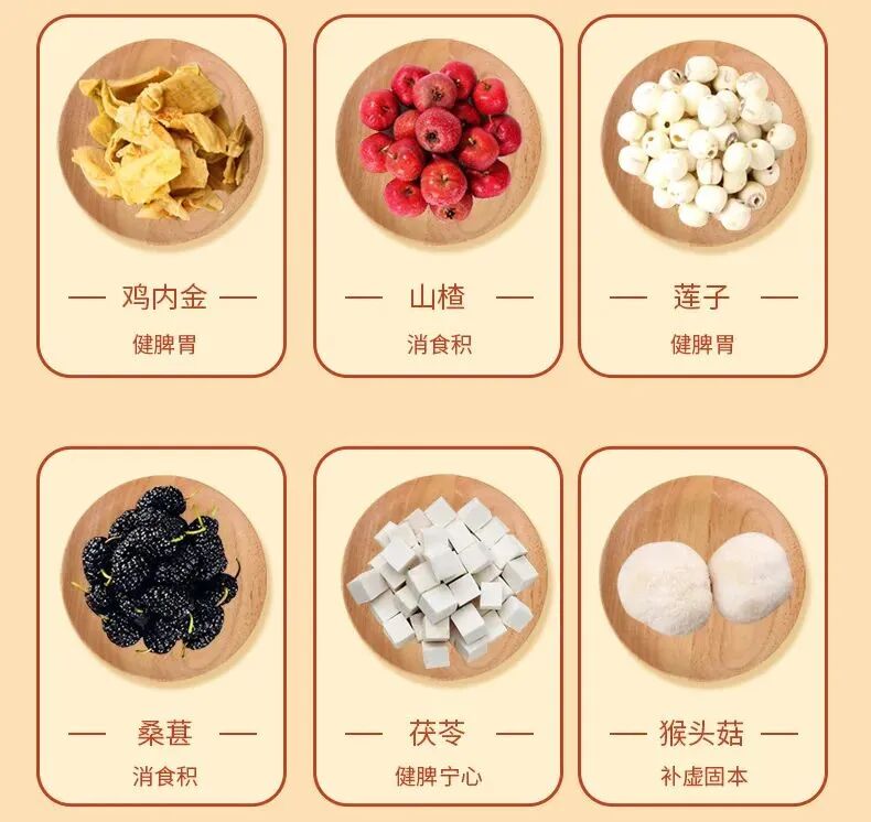 雞內金、茯苓、猴頭菇、蓮子健脾胃,化積除滯,加快腸胃活動,促進脾運化!