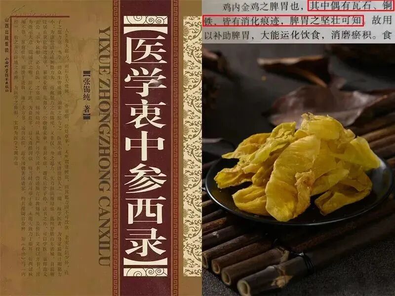 《醫學衷中參西錄》中記載:“雞內金,雞之脾胃也。其中偶有瓷石、銅、鐵皆能消化,其善化瘀積可知。”