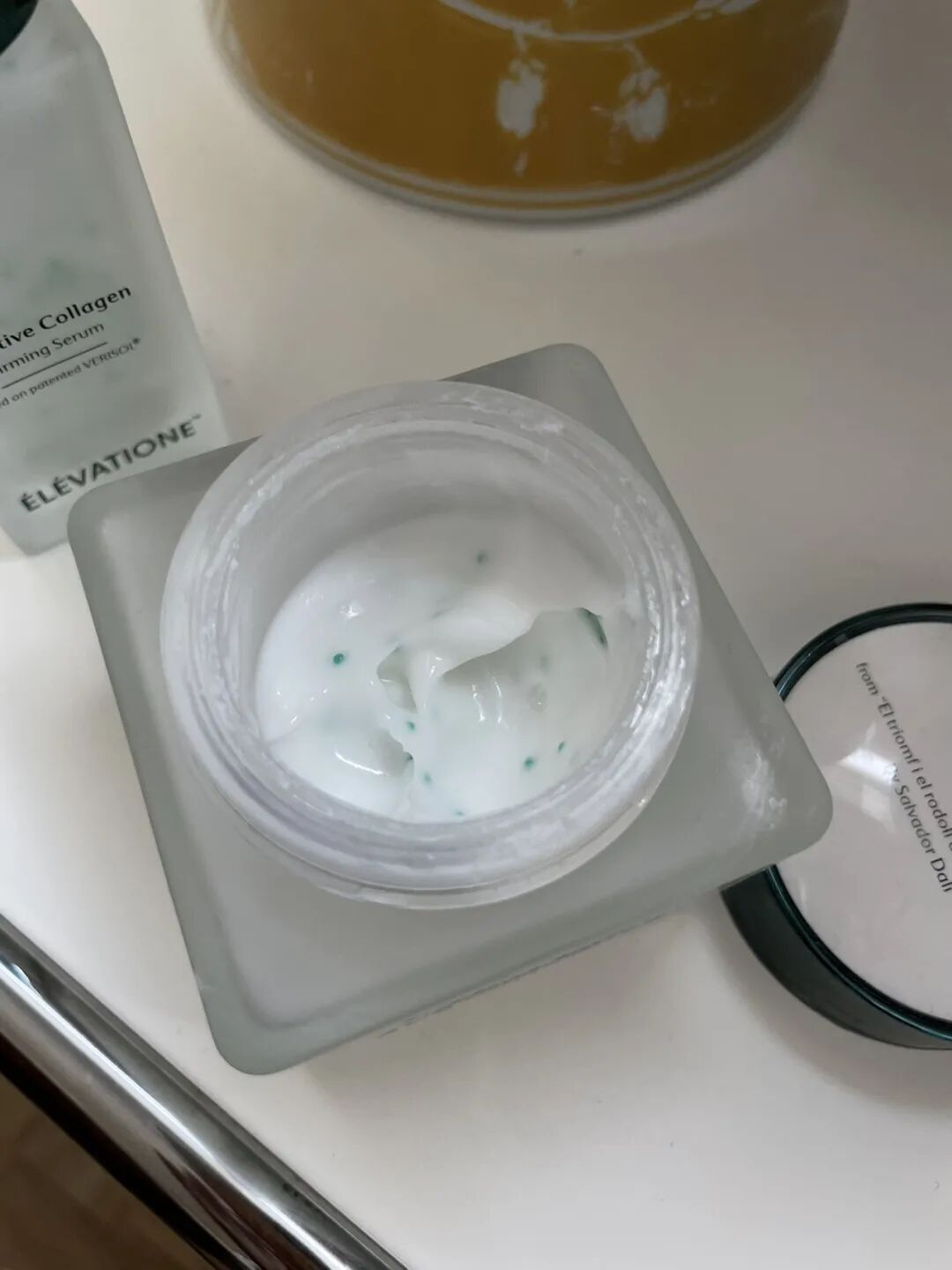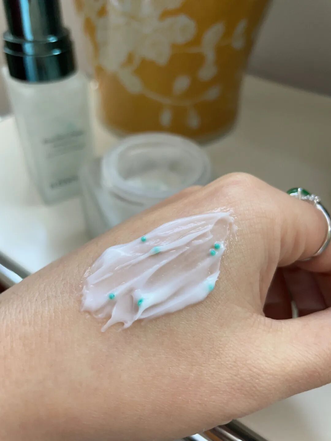 專利成分,幫助皮膚抗衰、修復,讓皮膚日益健康起來,富有彈性。看看這個面霜,我最喜歡的就是它,我猜想那個藍色的小珠珠就是核心VERISOL®成分,但我也沒有證據。使用感不錯,夠潤但是不油膩,吸收得很快。配合精華和麵膜一起使用,一個多月下來,在沒有用其他產品的情況下,我的皮膚有變得更平滑,瑩潤。