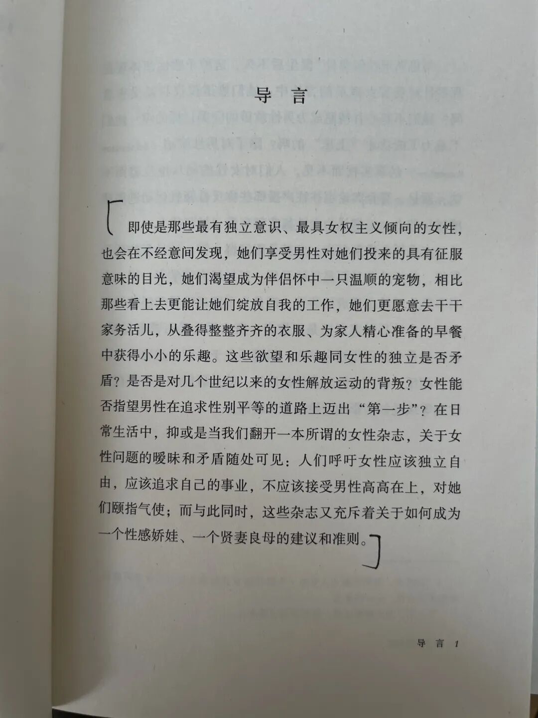 “即使是那些最有獨立意識、最具女權主義傾向的女性,也會在不經意間發現,她們享受男性對她們投來的具有徵服意味的目光,她們渴望成為伴侶懷中一隻溫順的寵物,相比那些看上去更能讓她們綻放自我的工作,她們更願意去幹幹家務活兒,從疊得整整齊齊的衣服、為家人精心準備的早餐中獲得小小的樂趣。這些慾望和樂趣同女性的獨立是否矛盾?是否是對幾個世紀以來的女性解放運動的背叛?女性能否指望男性在追求性別平等的道路上邁出“第一步”?在日常生活中,抑或是當我們翻開一本所謂的女性雜誌,關於女性問題的曖昧和矛盾隨處可見:人們呼籲女性應該獨立自由,應該追求自己的事業,不應該接受男性高高在上,對她們頤指氣使;而與此同時,這些雜誌又充斥著關於如何成為一個性感嬌娃、一個賢妻良母的建議和準則。”