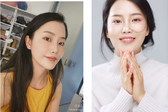 面如桃花,膚若凝脂、緊緻彈性,眼神清澈,光彩照人;