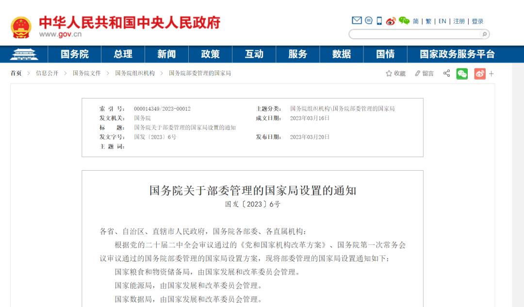 根據黨的二十屆二中全會審議通過的《黨和國家機構改革方案》、國務院第一次常務會議審議通過的國務院部委管理的國家局設置方案,現將部委管理的國家局設置通知如下:
