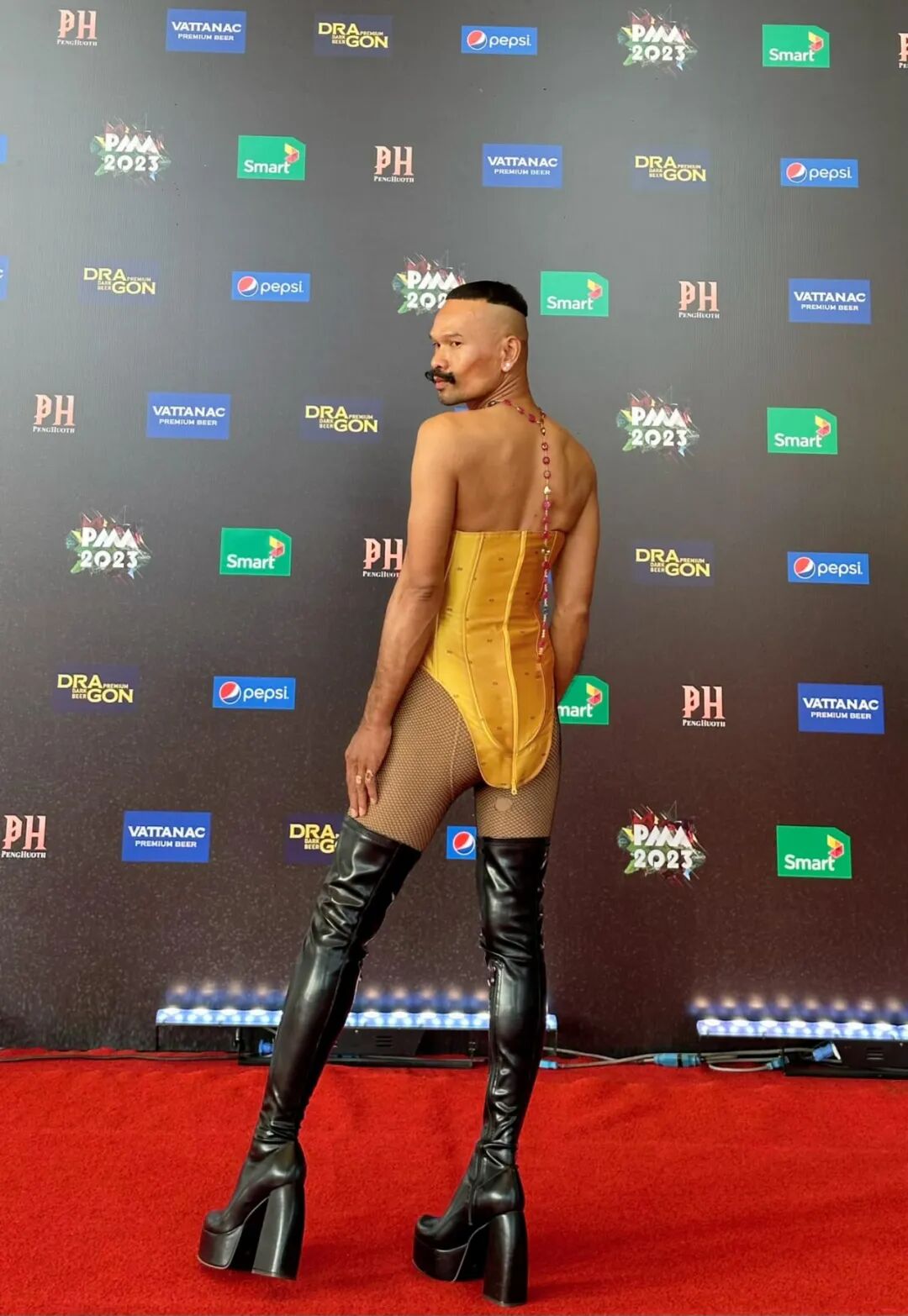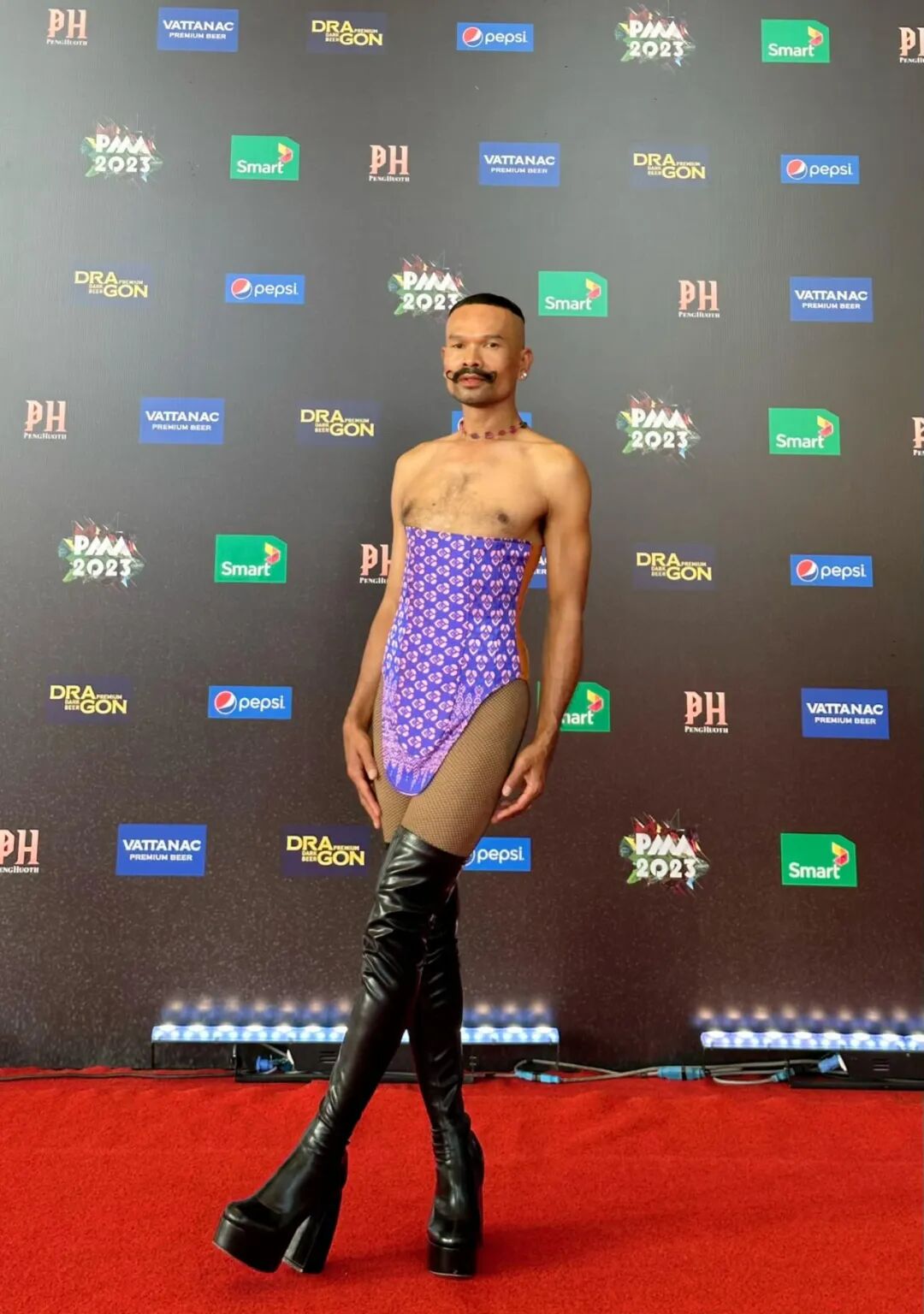3月18日晚,在出席Pleng Music Awards 2023紅毯時,這位柬埔寨知名設計師選擇了一套非常性感的裝扮。上身一條布料非常少的連衣服,下身則是黑色漁網襪+過膝長筒靴的搭配。