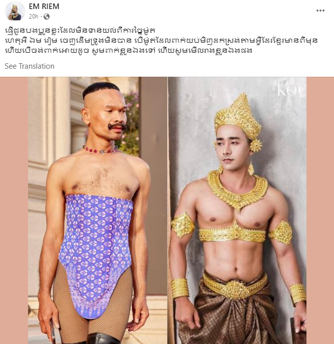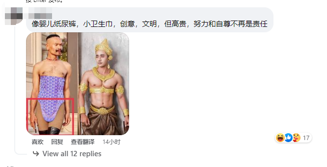 而在19日,他再次發帖回應,這次他特意貼出了自己的照片和高棉傳統服飾的對比照,表示:“對於一些還不懂設計的人,我昨晚穿的時裝是根據高棉傳統服飾創作的,為什麼我不能穿出門,如果你想那樣穿,請你自己穿,管好你自己的身體。”