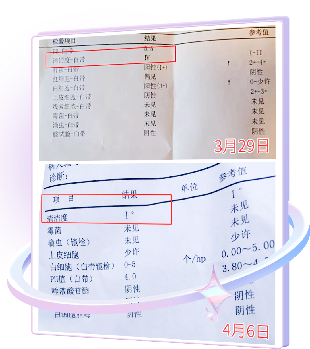 閨蜜除了醫生開的藥,還連續用了一星期芽覓,再去複查時,私處的清潔度直接從異常的四度,恢復到健康的一度!