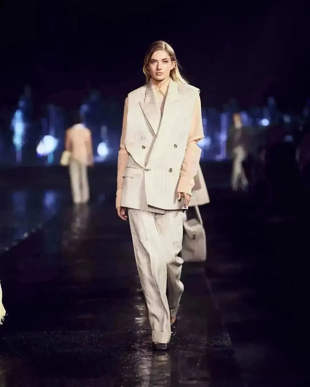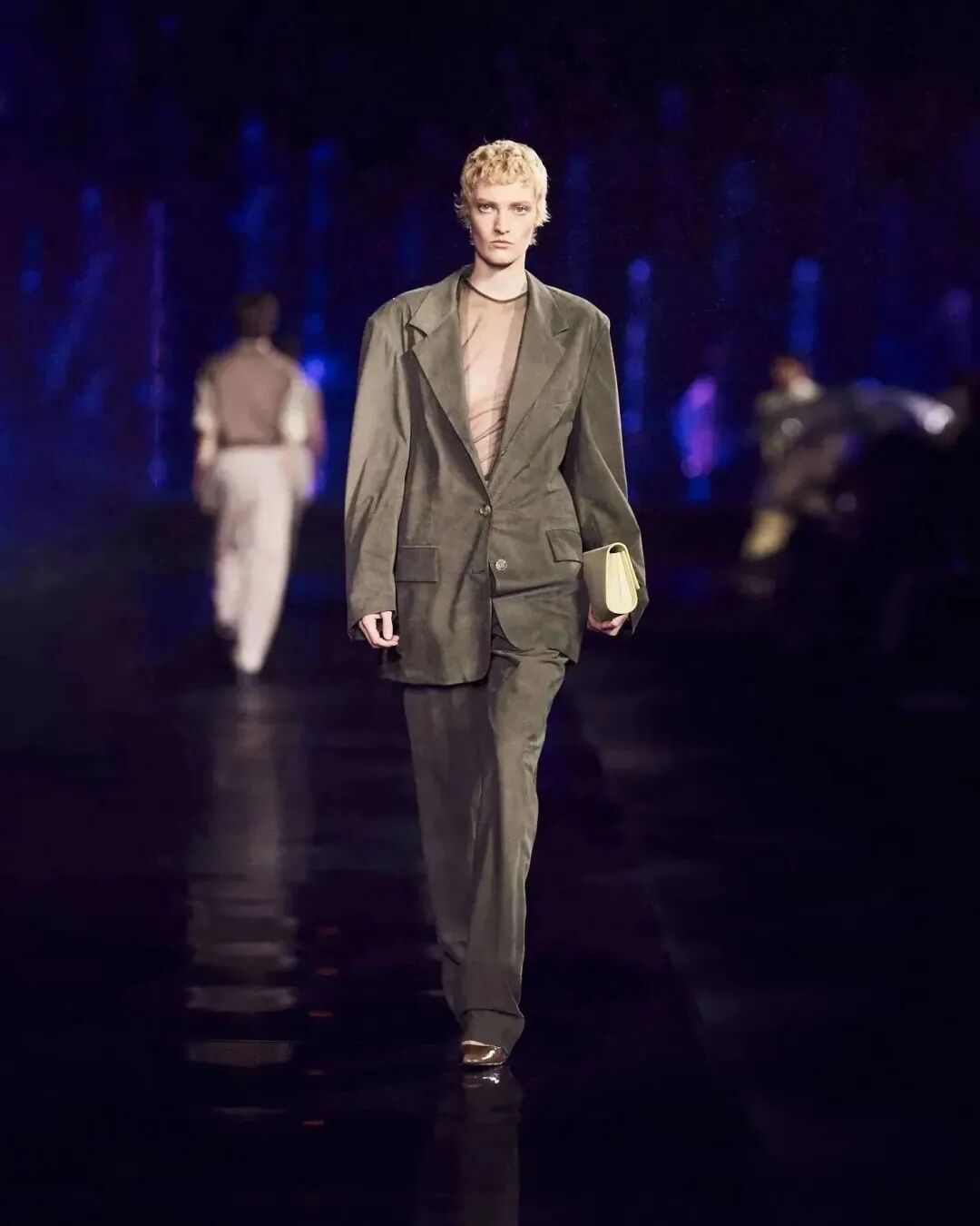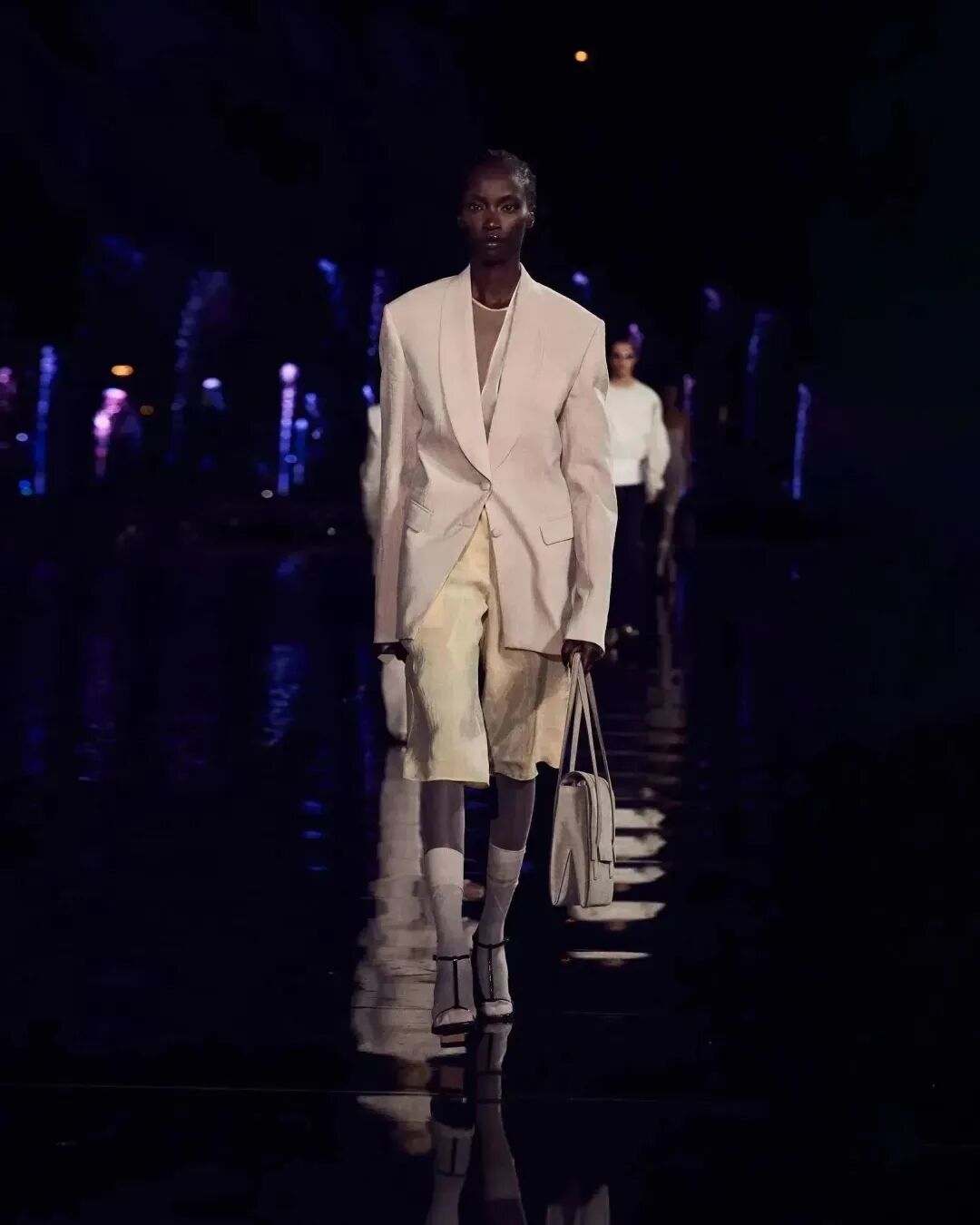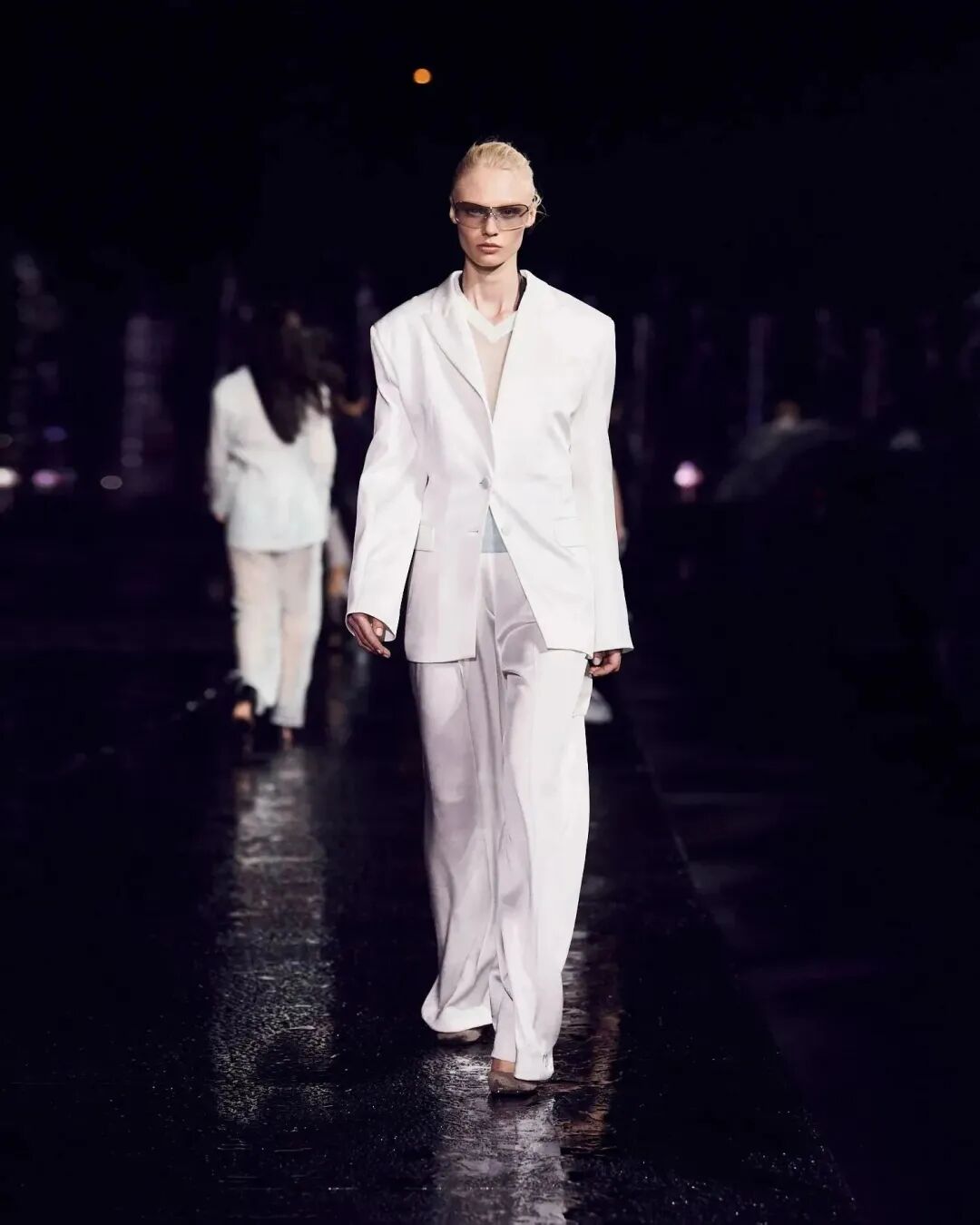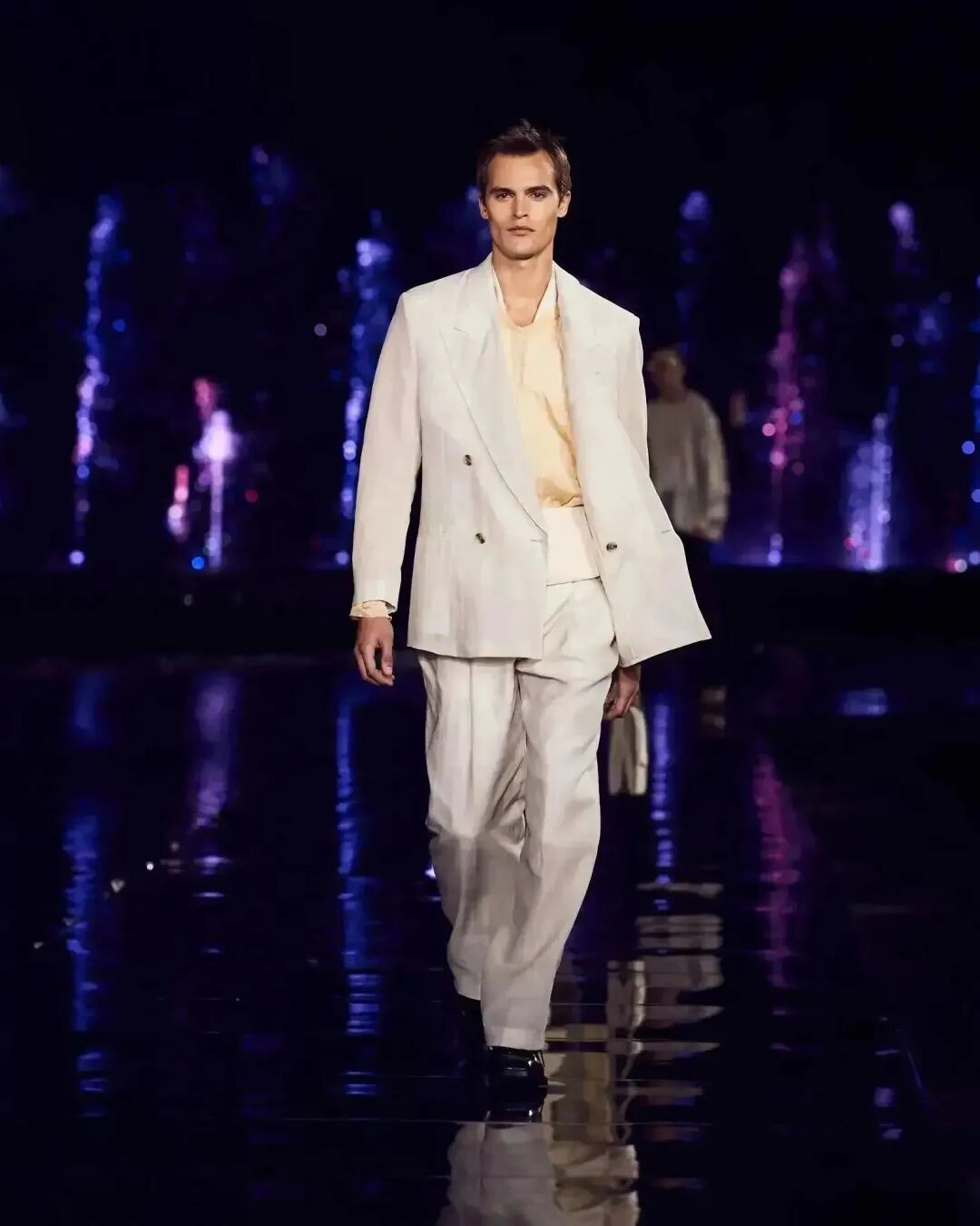 言歸正傳,本季BOSS基於進取與創新理念,融合了黃油質感的絲綢與光滑尼龍,歷經層壓工藝,形成具有色彩的輕盈褶皺質感,與秀場波光粼粼的水光相映成趣,倒是讓原本略感乏味的職業裝富有年輕化的輕盈質感。