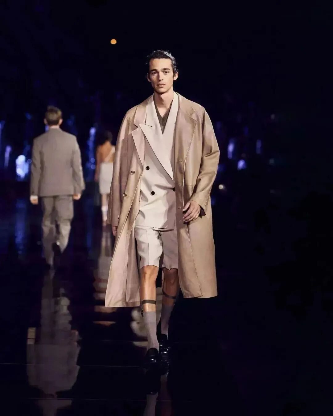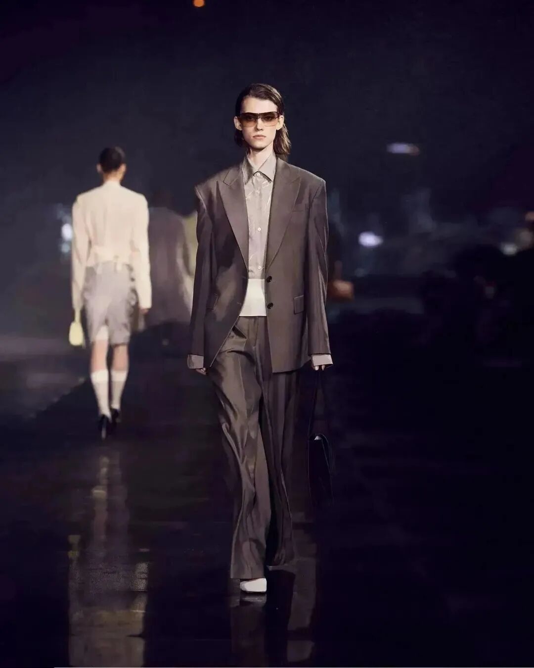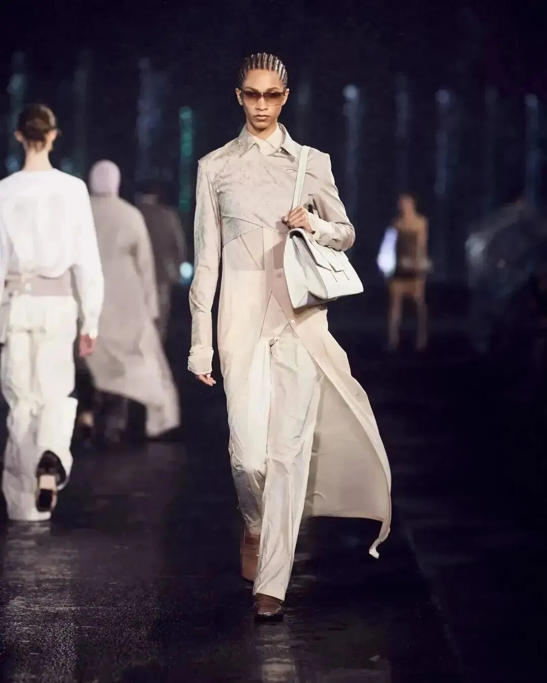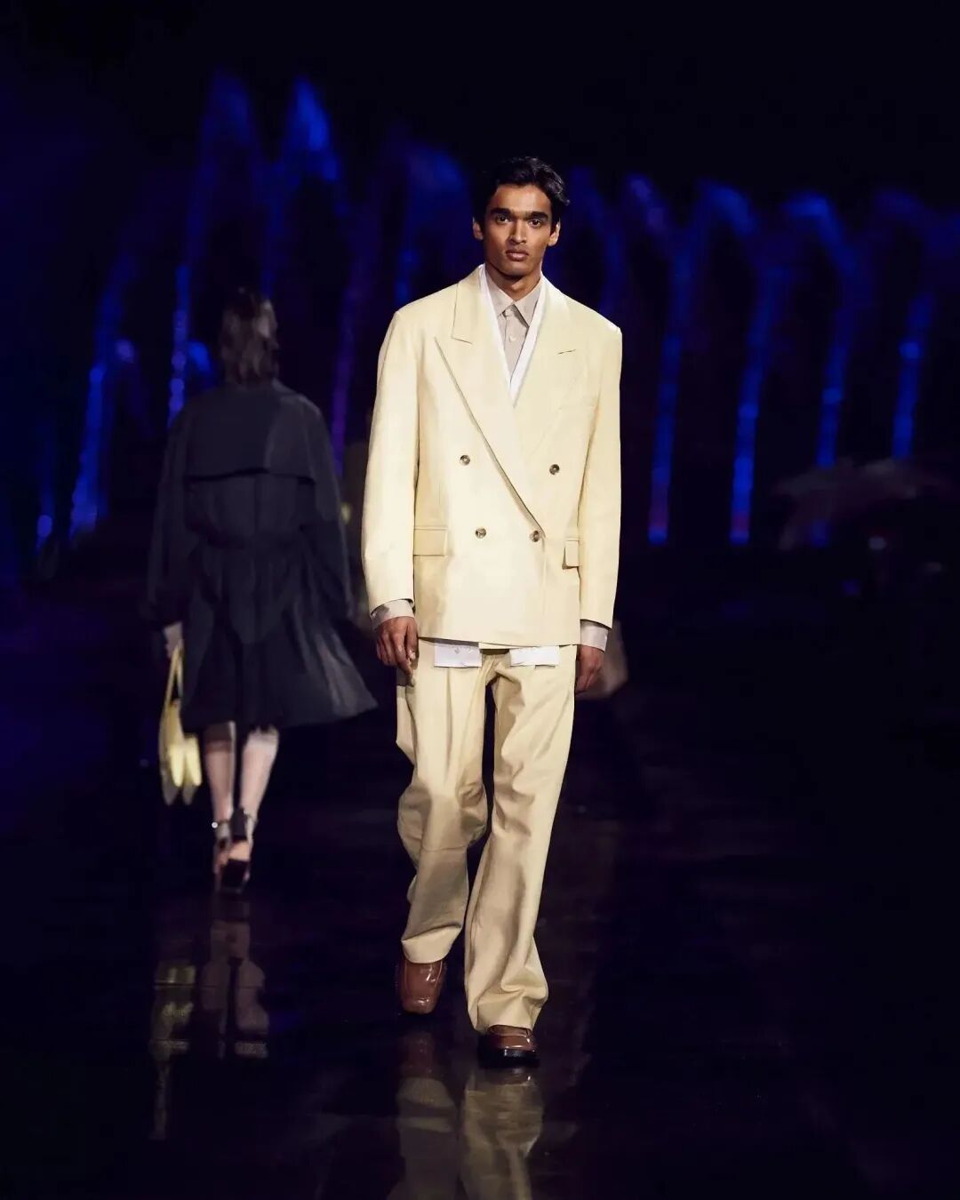 言歸正傳,本季BOSS基於進取與創新理念,融合了黃油質感的絲綢與光滑尼龍,歷經層壓工藝,形成具有色彩的輕盈褶皺質感,與秀場波光粼粼的水光相映成趣,倒是讓原本略感乏味的職業裝富有年輕化的輕盈質感。