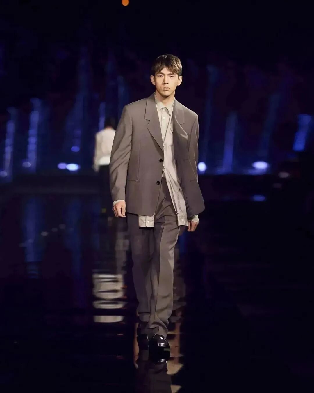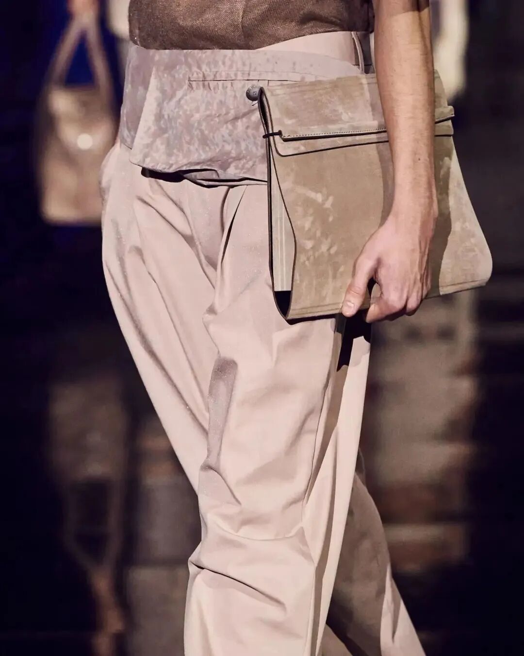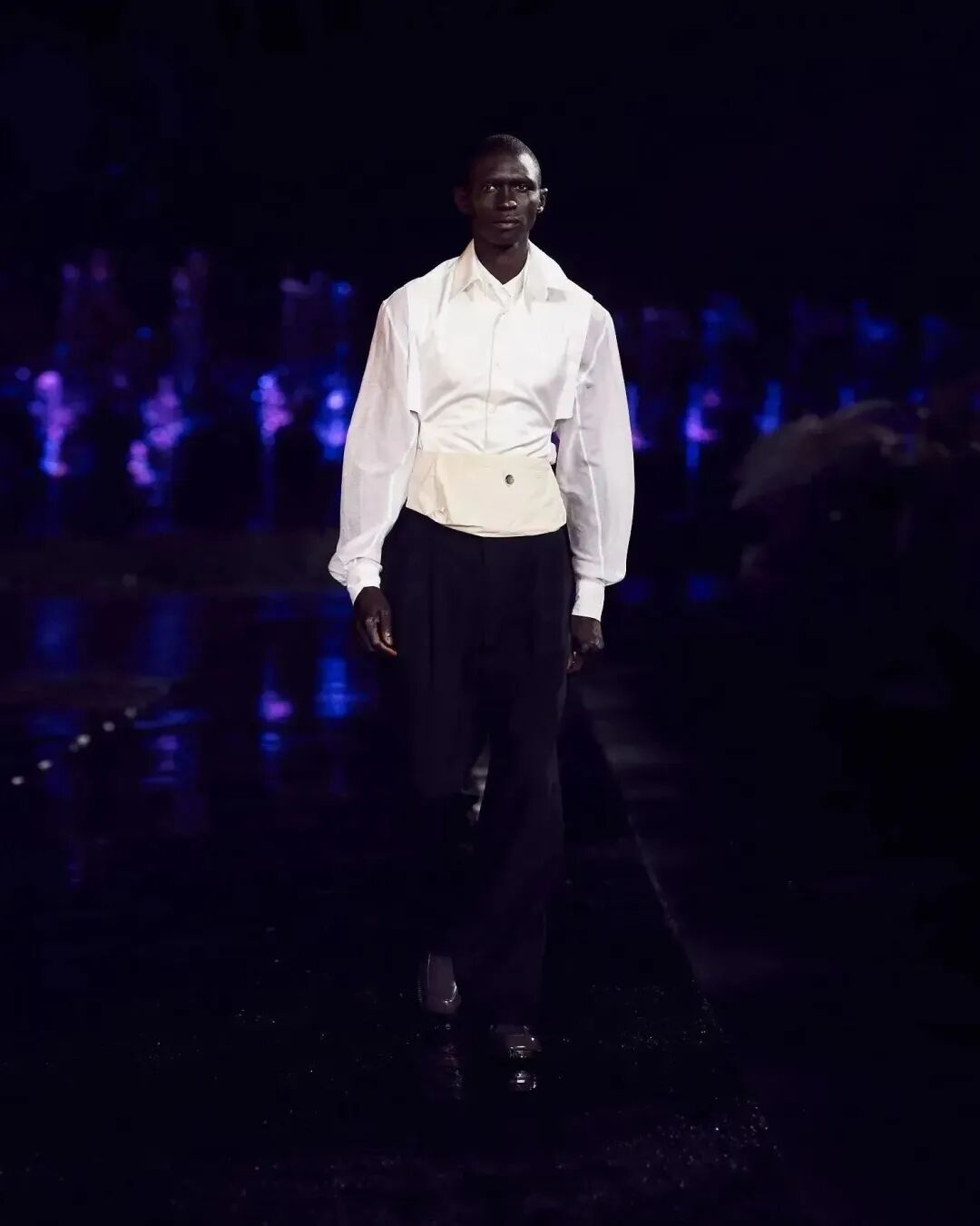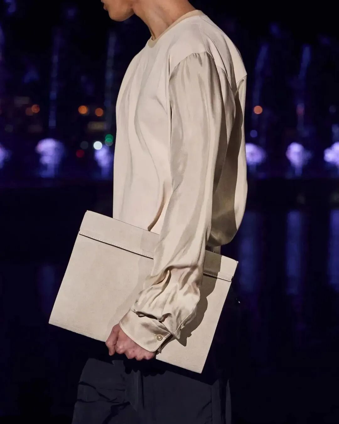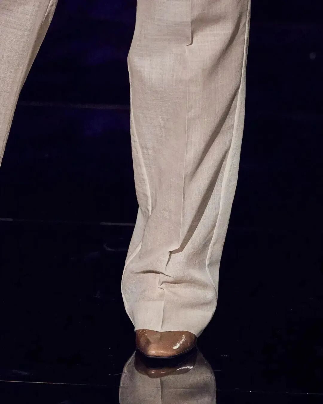 言歸正傳,本季BOSS基於進取與創新理念,融合了黃油質感的絲綢與光滑尼龍,歷經層壓工藝,形成具有色彩的輕盈褶皺質感,與秀場波光粼粼的水光相映成趣,倒是讓原本略感乏味的職業裝富有年輕化的輕盈質感。