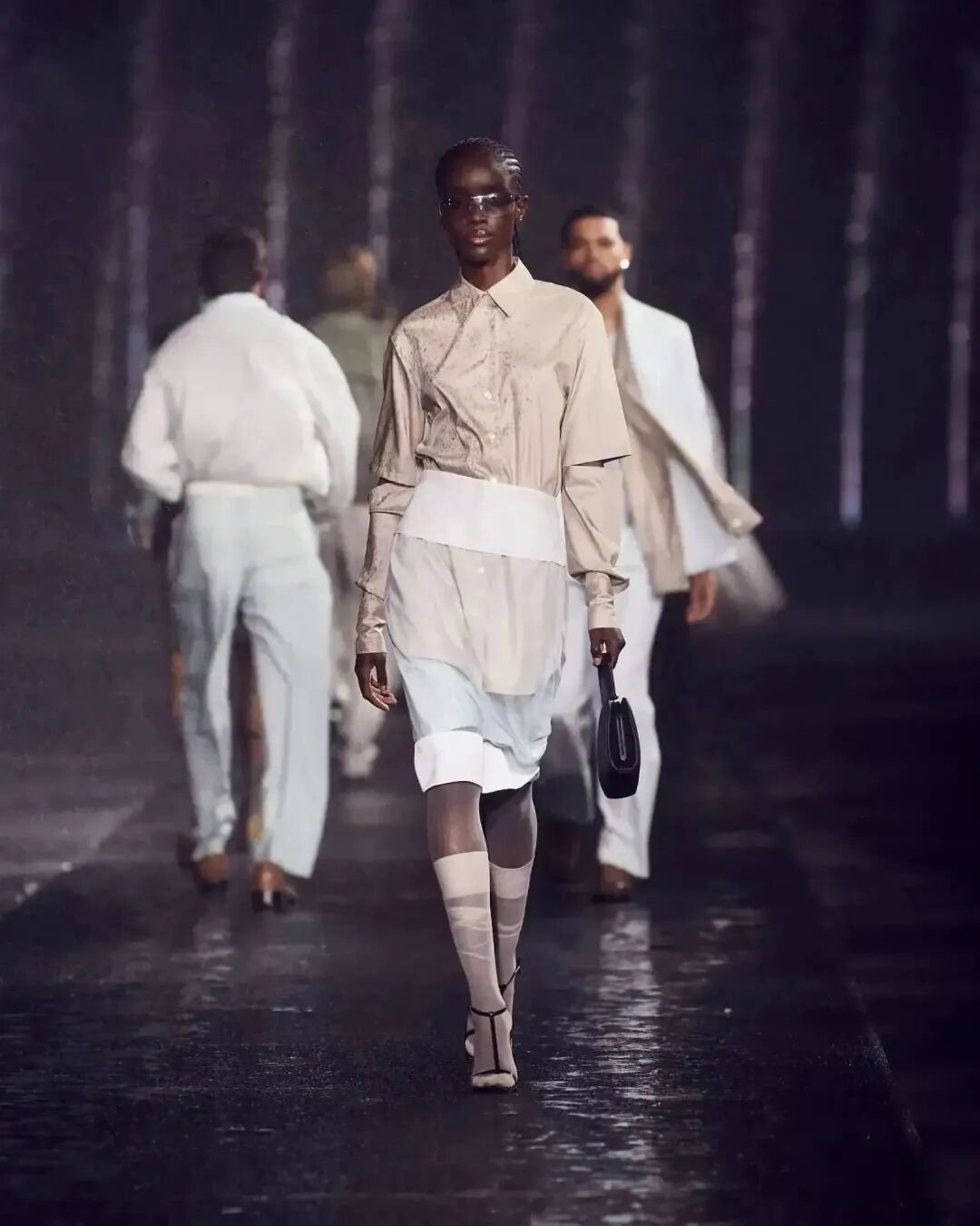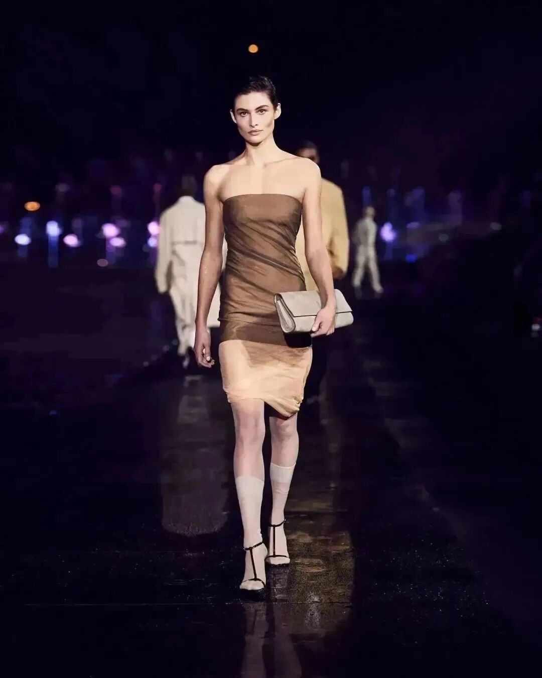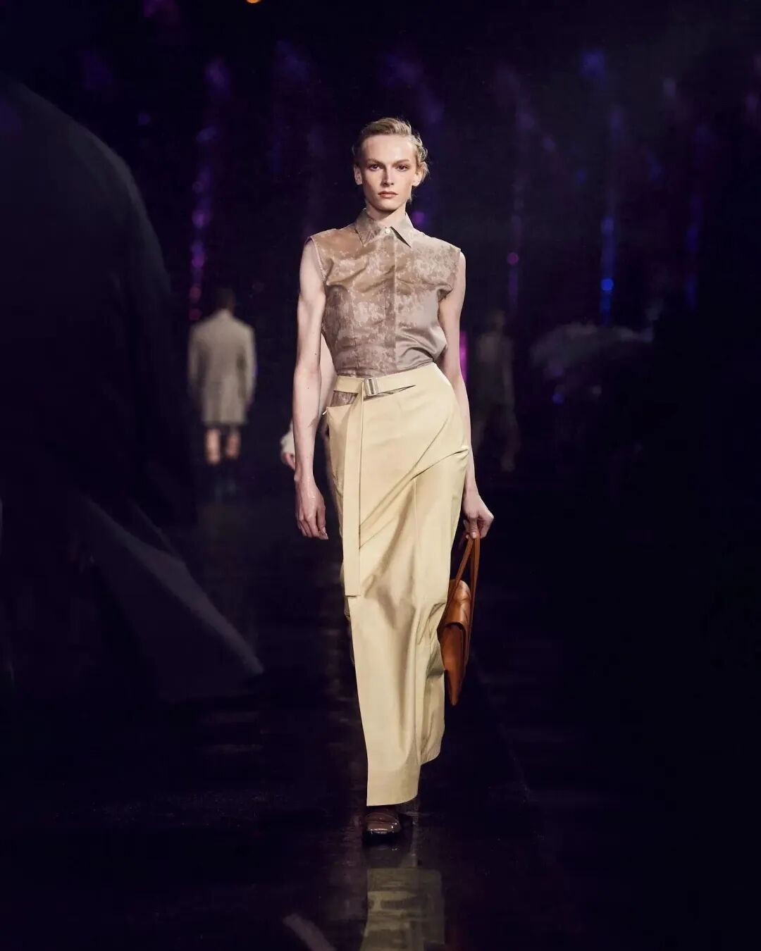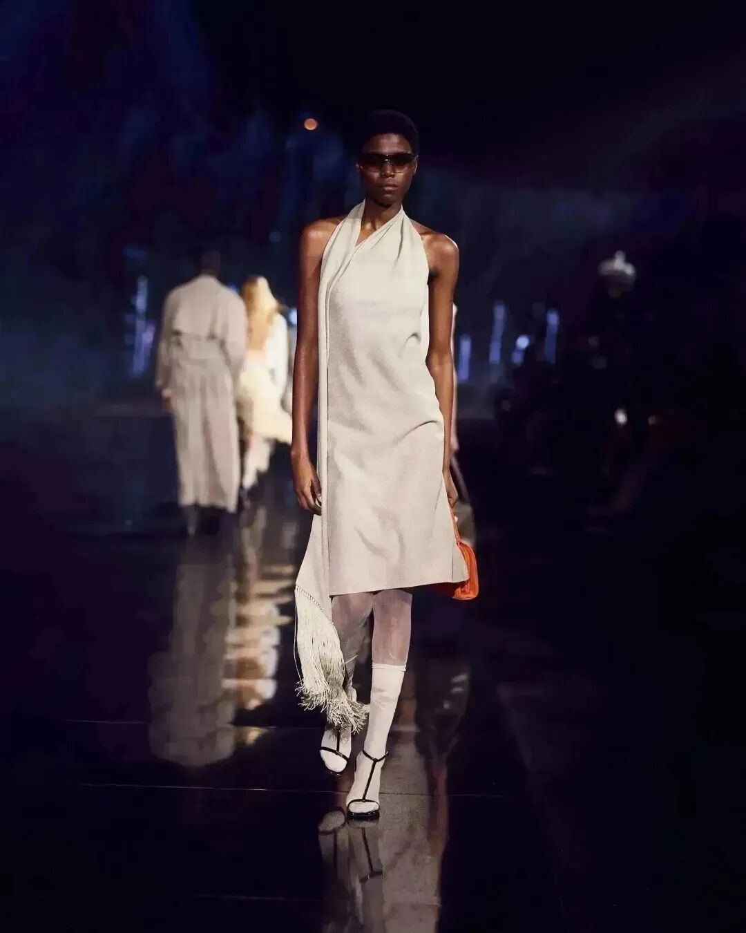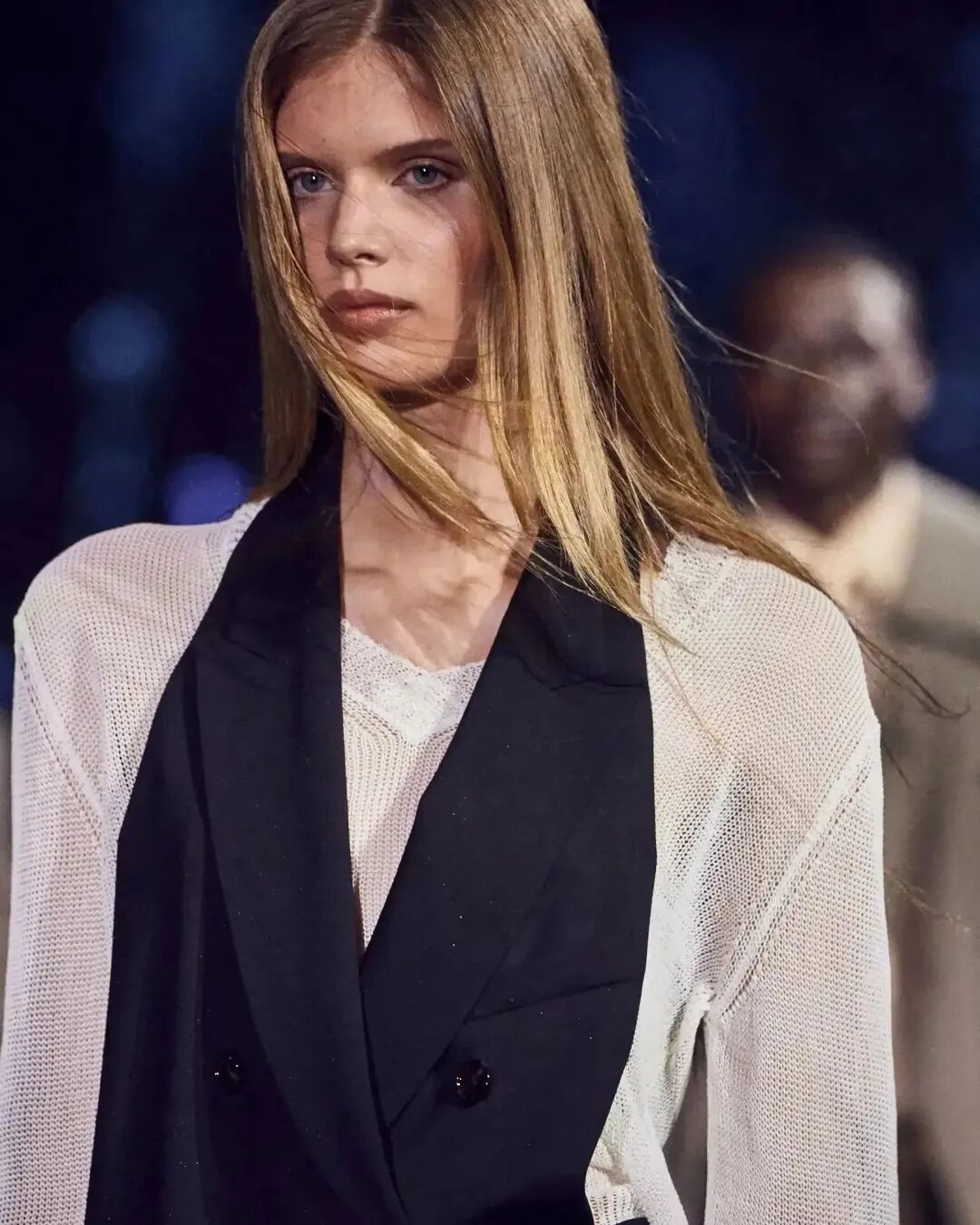 高級的性感在於不經意的“露”,神秘感始終能夠為慾望帶來原始衝動。對比元素之間的微妙張力成為此係列的核心主題之一——固態與流動性、陸地與海洋、不透明與透明、過往與現在。BOSS在這季將輕薄的面料與分明的結構輪廓巧妙融合,垂墜的薄紗中透露出些許裸色肌膚,筆直流暢的剪裁下猶如嚴謹的建築線條,在剋制和隱約中將性感的張力展現得淋漓盡致。你可以把他理解為old money眼中的復古趣味,也可以理解為直白的挑逗,但皆是為了讓人們在無垠遐想中體味時裝語言的魅力,展現真我風範。