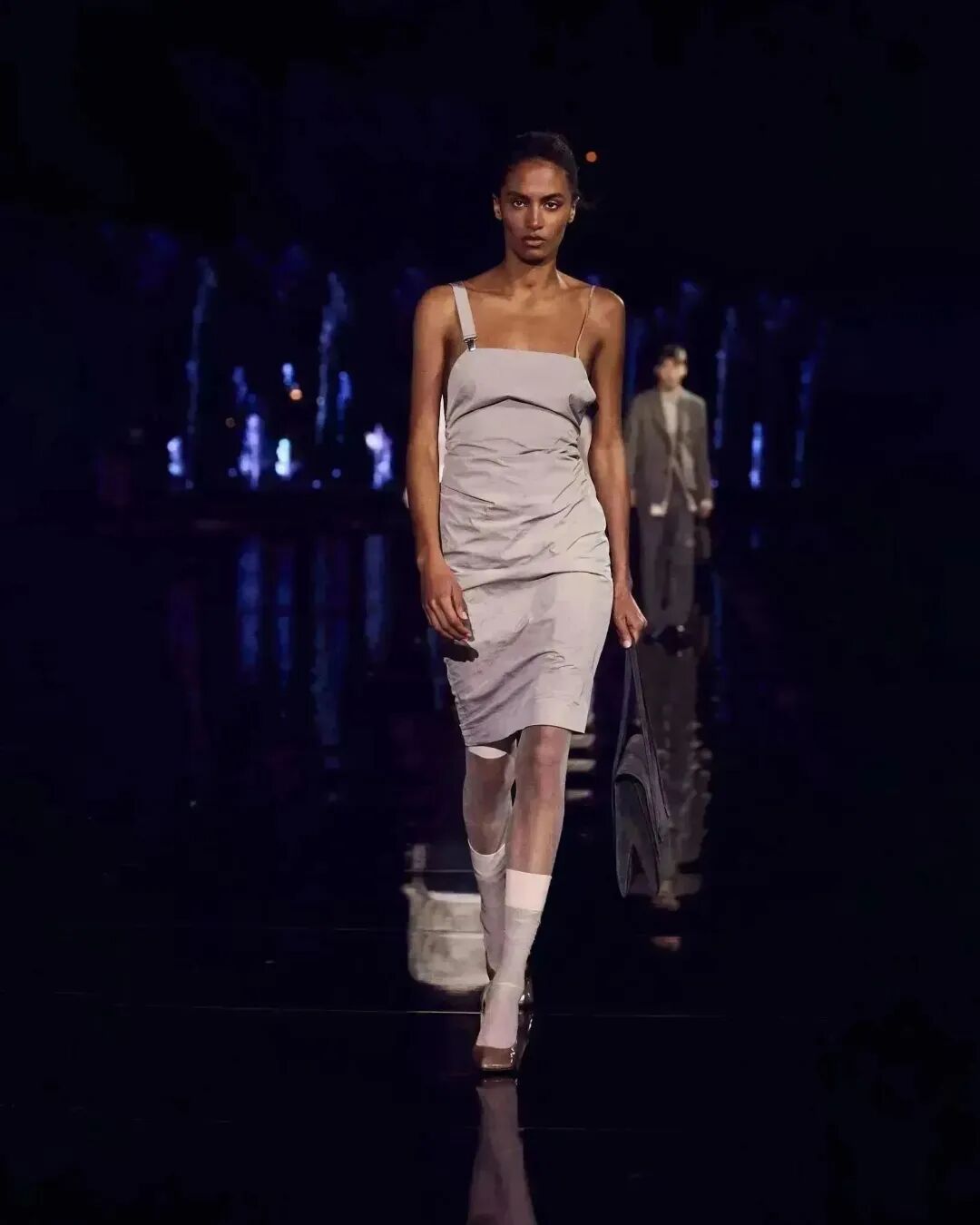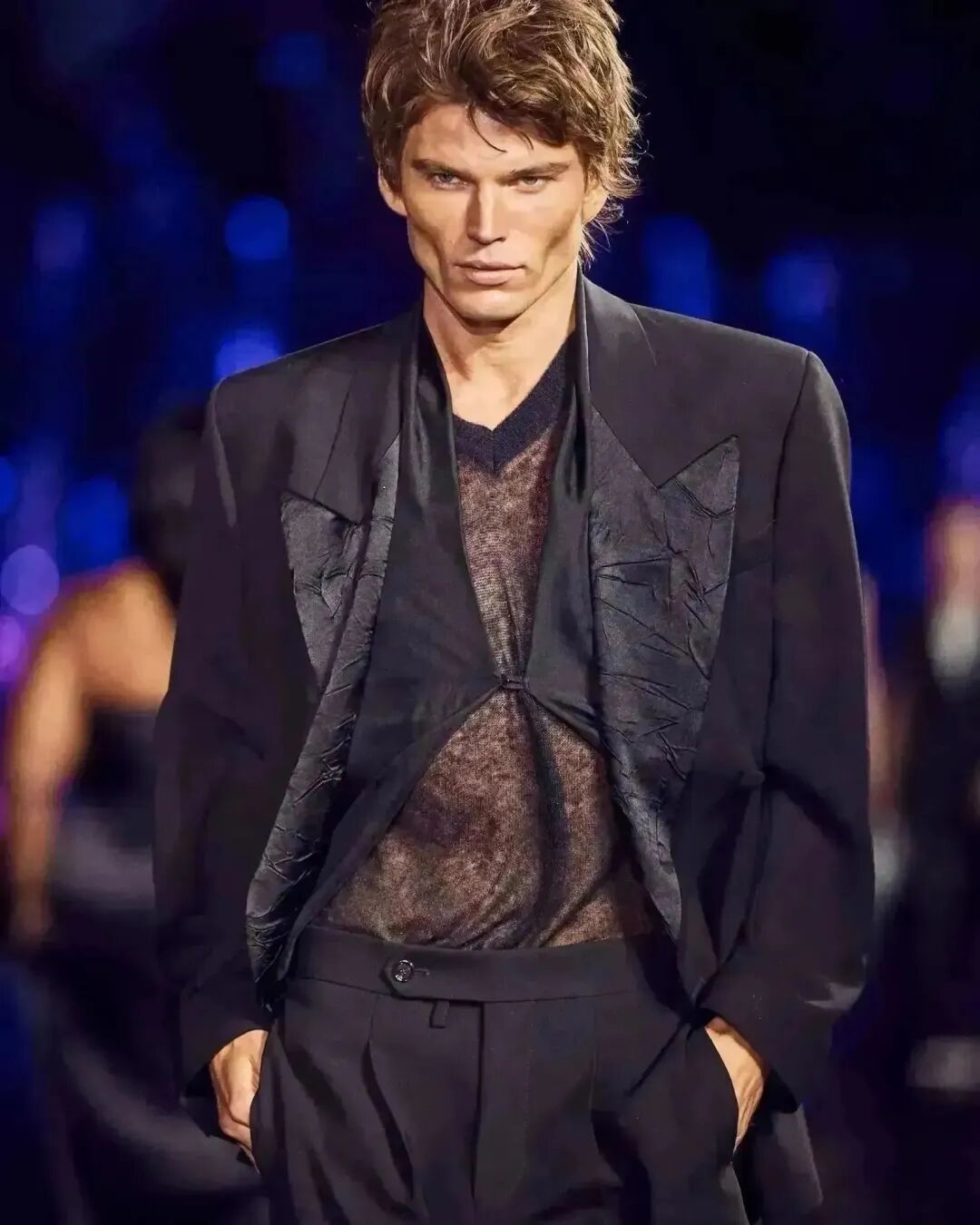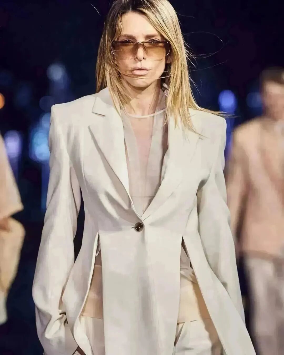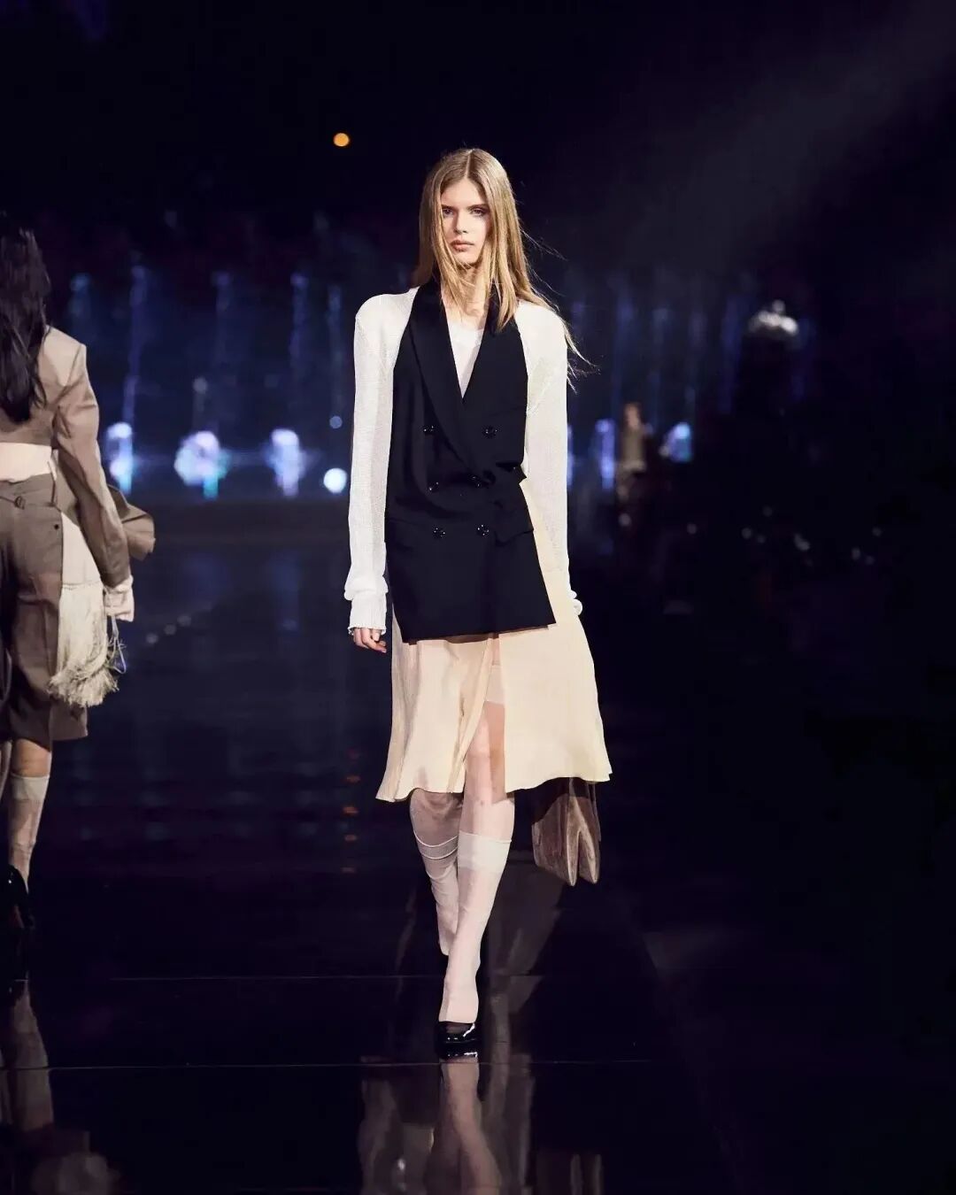 高級的性感在於不經意的“露”,神秘感始終能夠為慾望帶來原始衝動。對比元素之間的微妙張力成為此係列的核心主題之一——固態與流動性、陸地與海洋、不透明與透明、過往與現在。BOSS在這季將輕薄的面料與分明的結構輪廓巧妙融合,垂墜的薄紗中透露出些許裸色肌膚,筆直流暢的剪裁下猶如嚴謹的建築線條,在剋制和隱約中將性感的張力展現得淋漓盡致。你可以把他理解為old money眼中的復古趣味,也可以理解為直白的挑逗,但皆是為了讓人們在無垠遐想中體味時裝語言的魅力,展現真我風範。