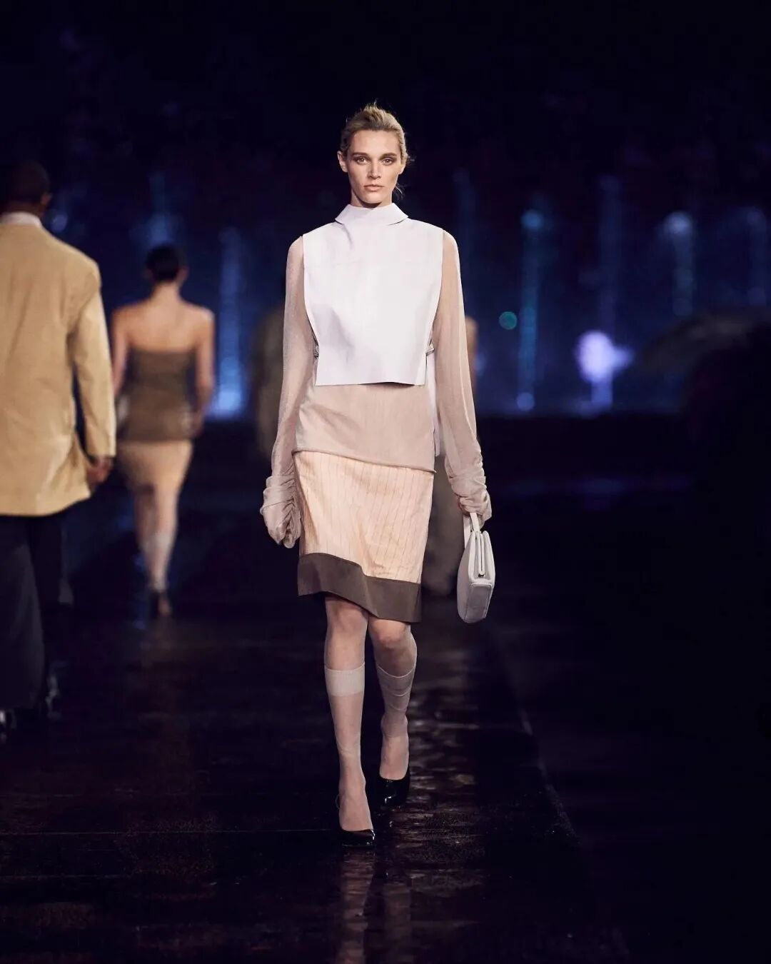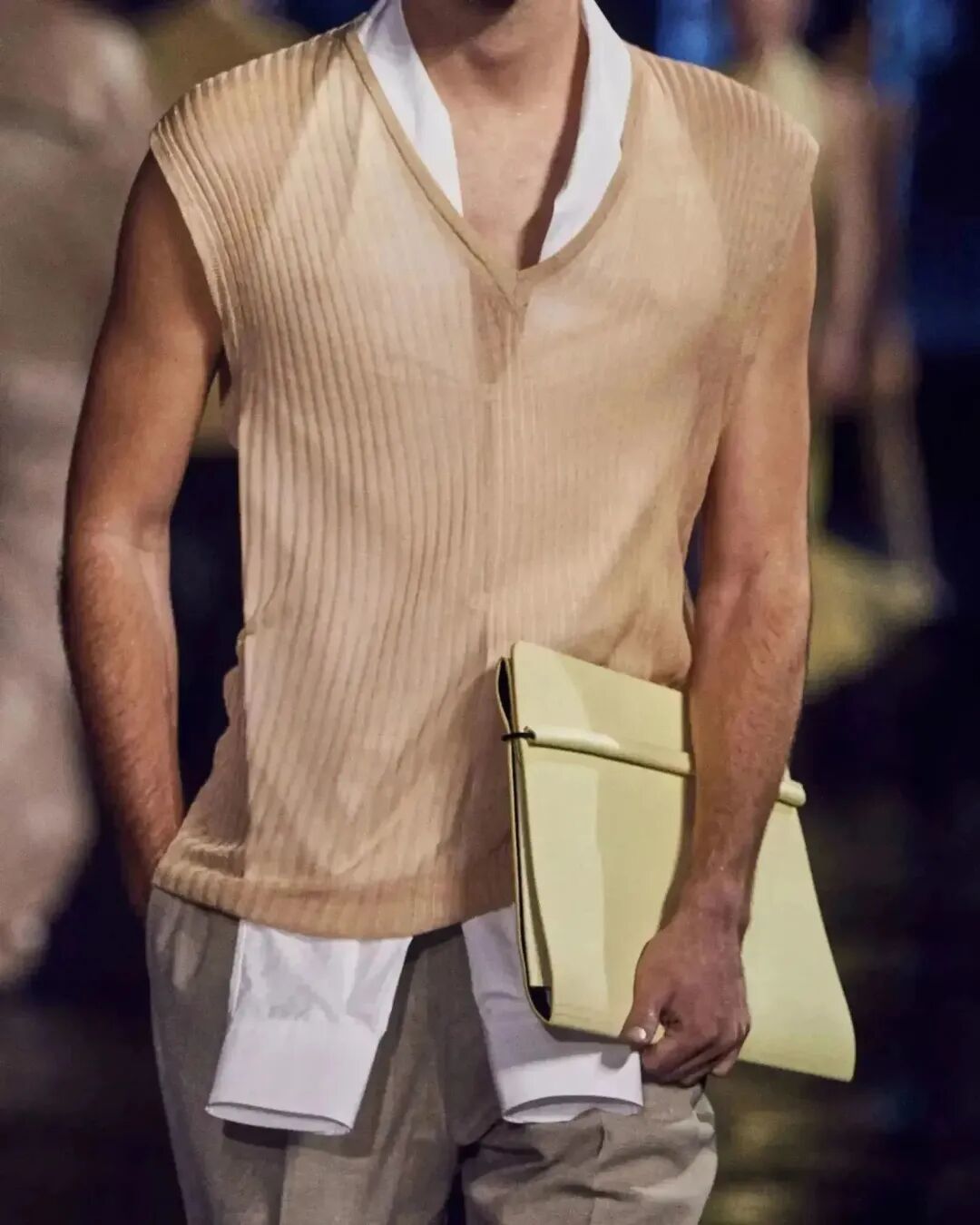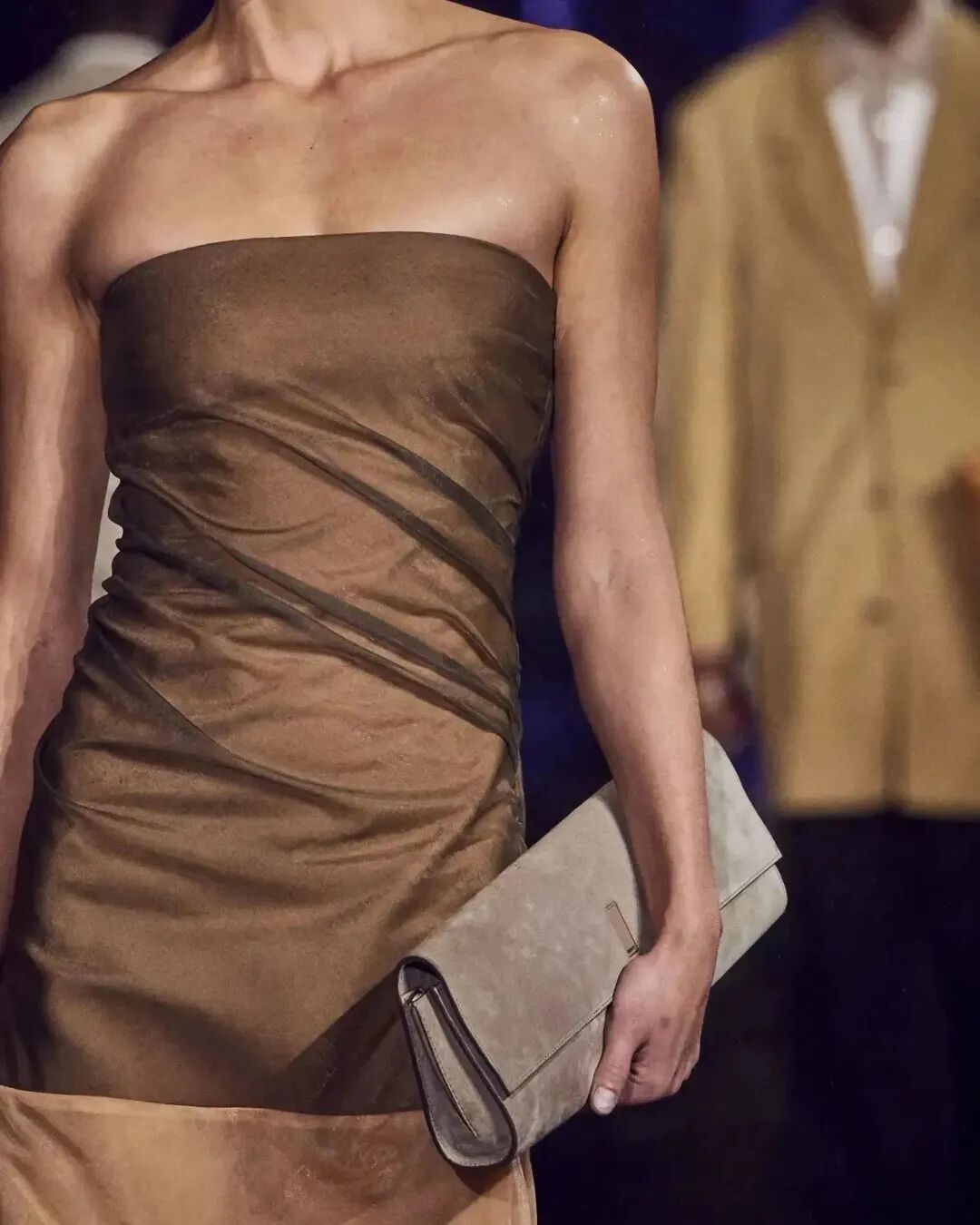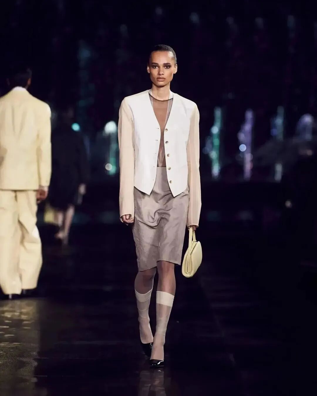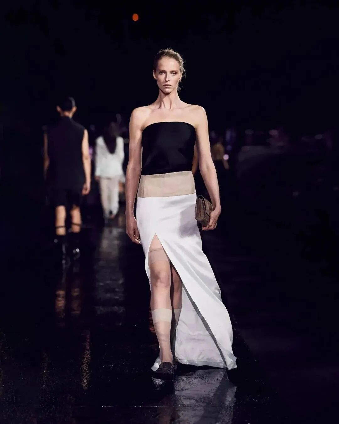 高級的性感在於不經意的“露”,神秘感始終能夠為慾望帶來原始衝動。對比元素之間的微妙張力成為此係列的核心主題之一——固態與流動性、陸地與海洋、不透明與透明、過往與現在。BOSS在這季將輕薄的面料與分明的結構輪廓巧妙融合,垂墜的薄紗中透露出些許裸色肌膚,筆直流暢的剪裁下猶如嚴謹的建築線條,在剋制和隱約中將性感的張力展現得淋漓盡致。你可以把他理解為old money眼中的復古趣味,也可以理解為直白的挑逗,但皆是為了讓人們在無垠遐想中體味時裝語言的魅力,展現真我風範。