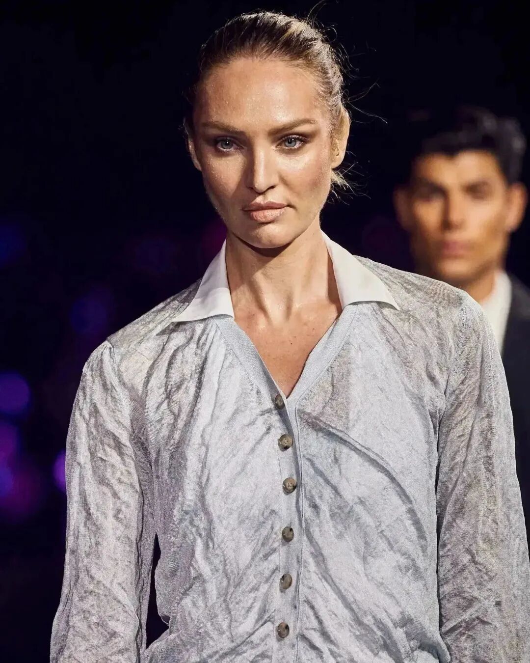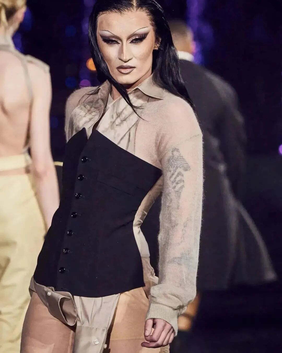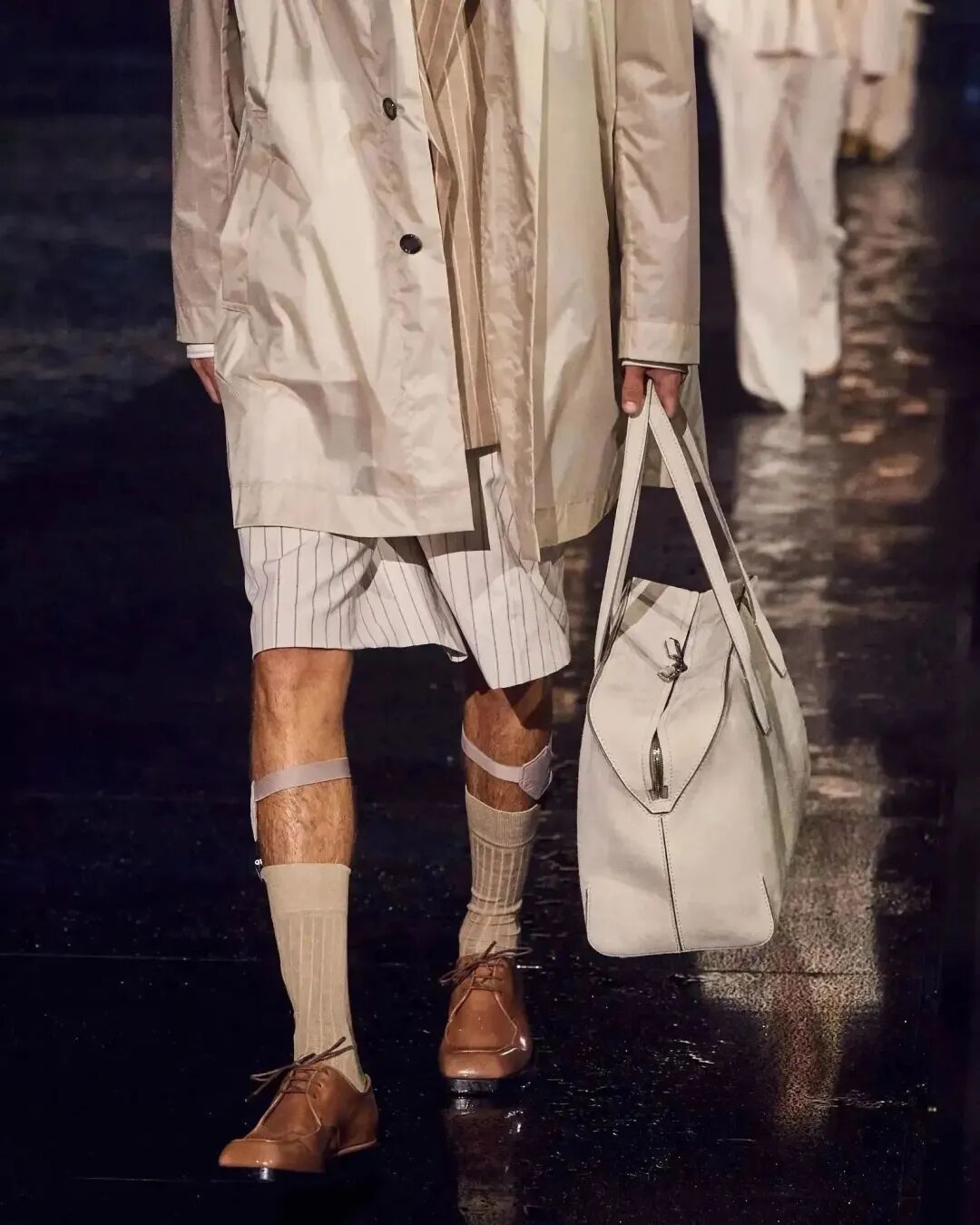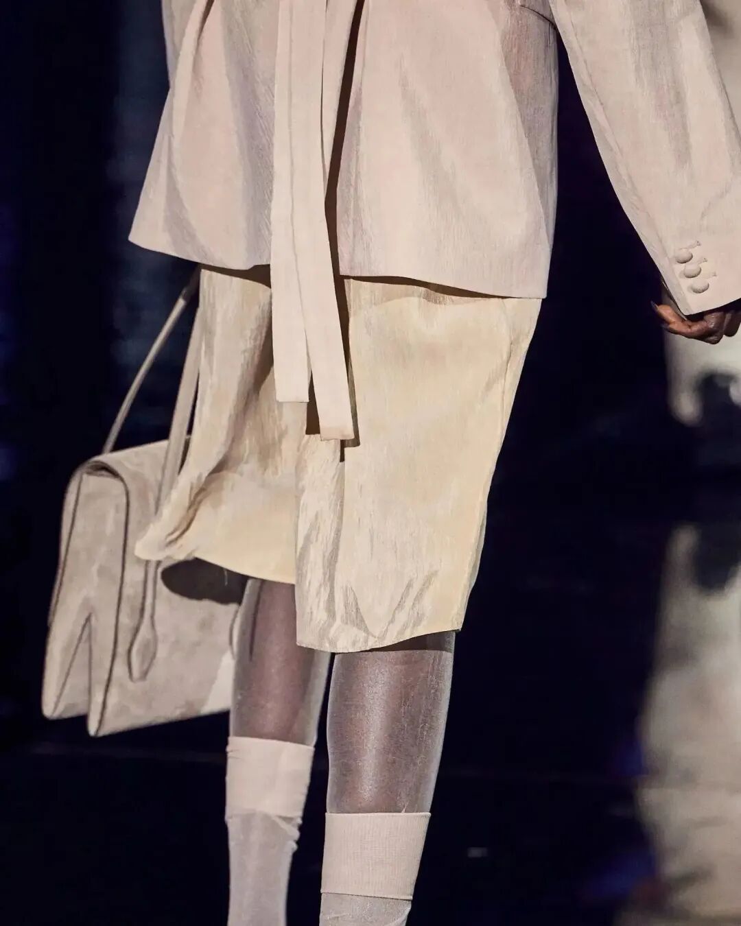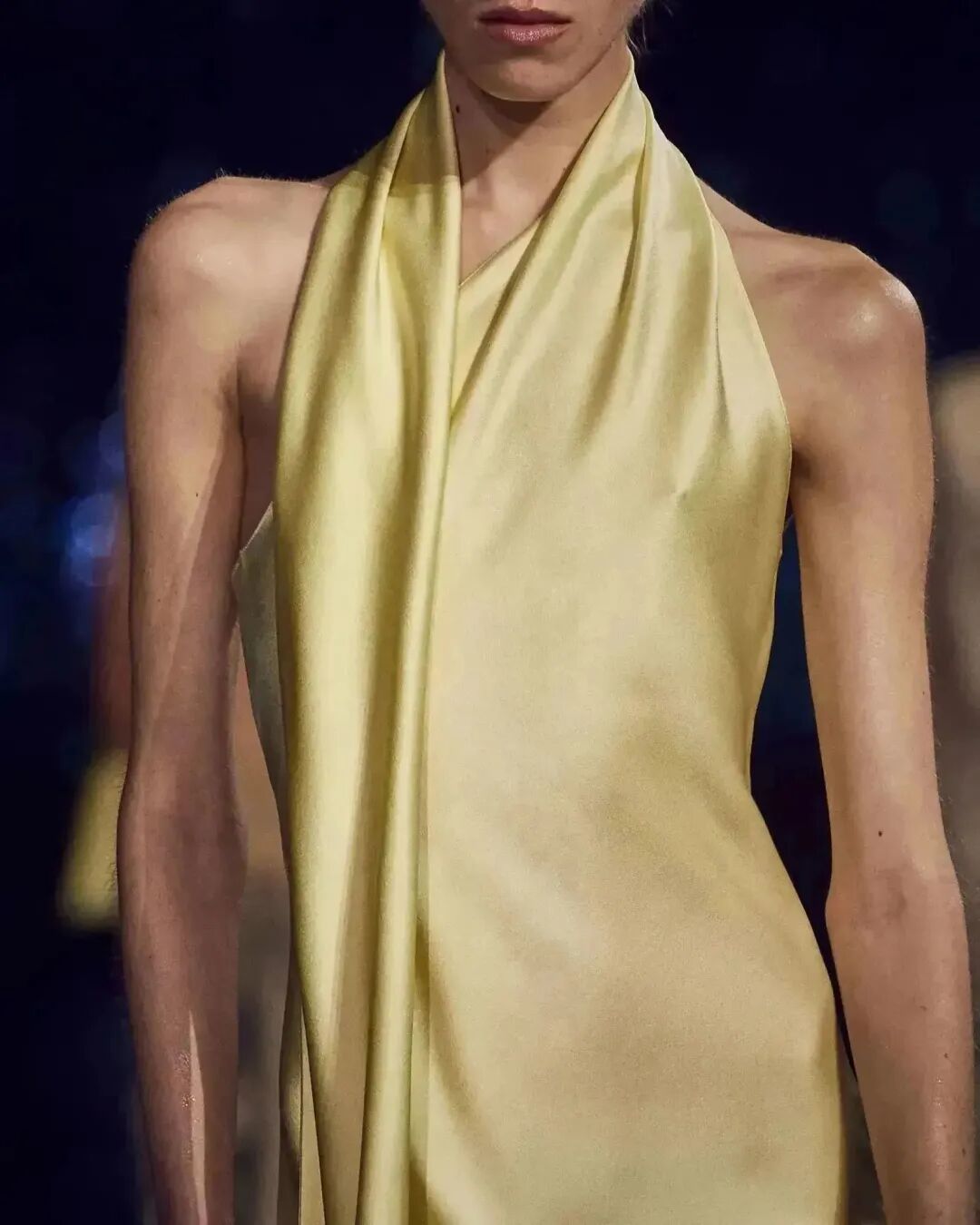 高級的性感在於不經意的“露”,神秘感始終能夠為慾望帶來原始衝動。對比元素之間的微妙張力成為此係列的核心主題之一——固態與流動性、陸地與海洋、不透明與透明、過往與現在。BOSS在這季將輕薄的面料與分明的結構輪廓巧妙融合,垂墜的薄紗中透露出些許裸色肌膚,筆直流暢的剪裁下猶如嚴謹的建築線條,在剋制和隱約中將性感的張力展現得淋漓盡致。你可以把他理解為old money眼中的復古趣味,也可以理解為直白的挑逗,但皆是為了讓人們在無垠遐想中體味時裝語言的魅力,展現真我風範。