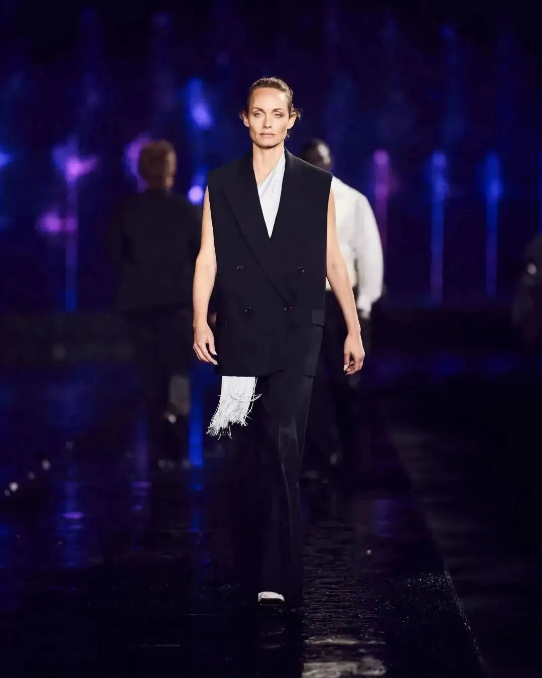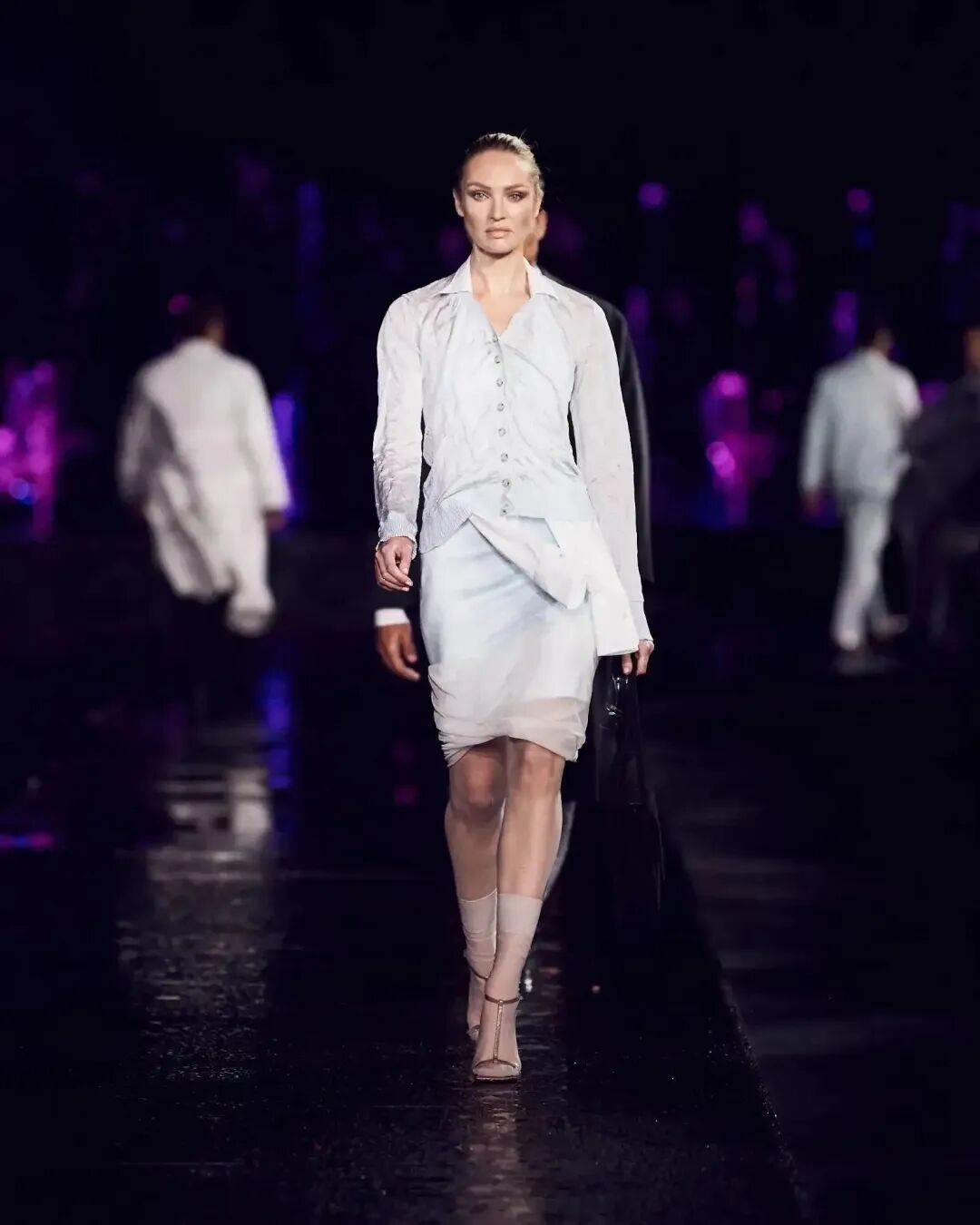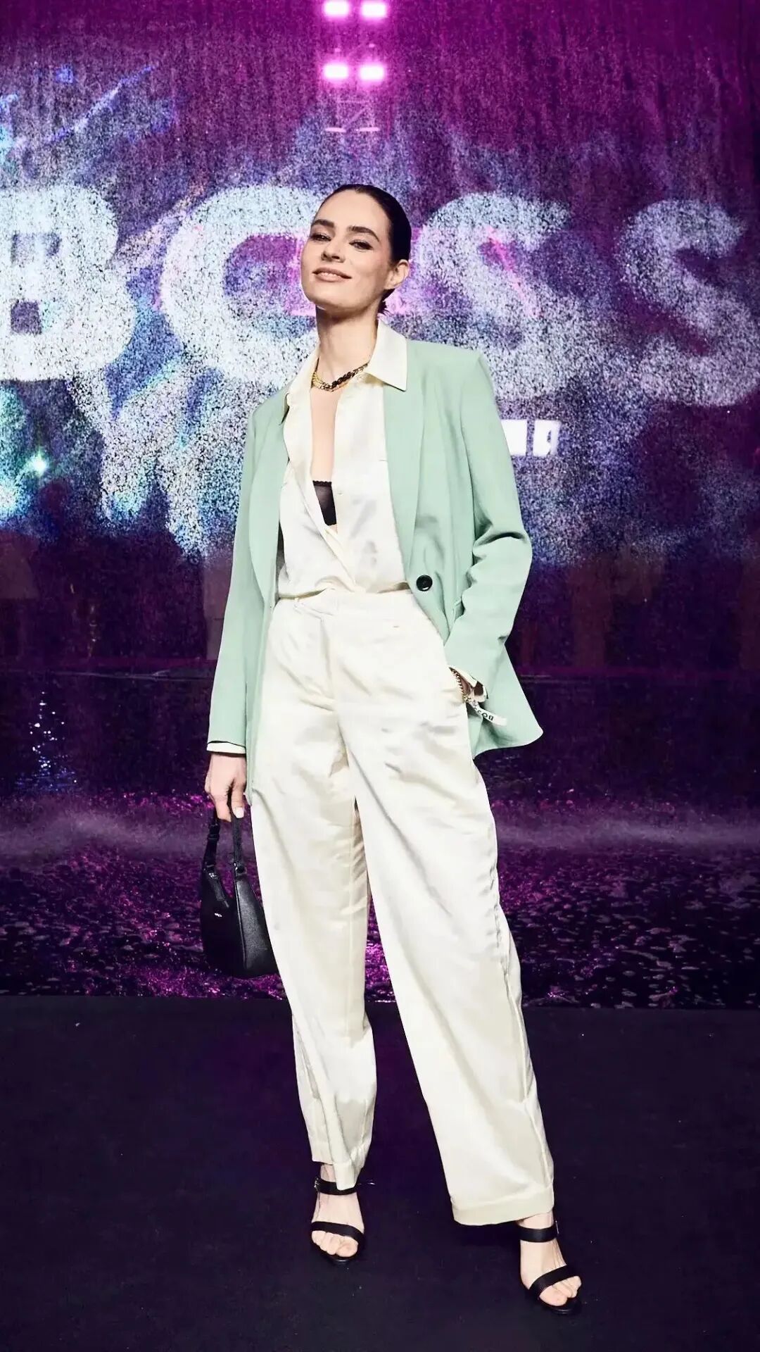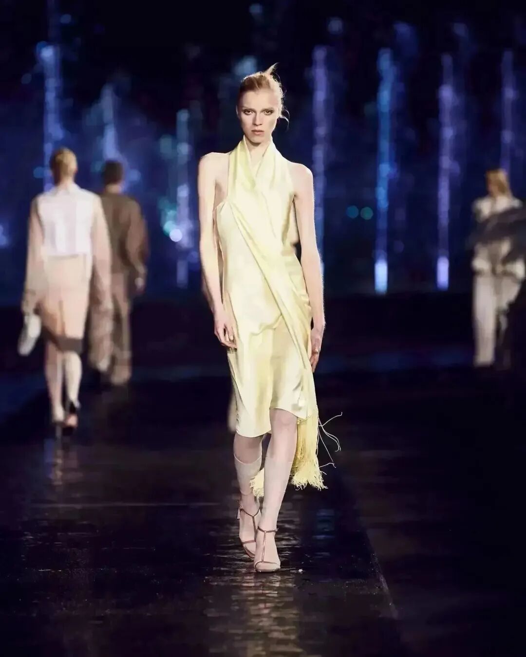 本季,透明這一概念延展至整個秀場佈景,以現代感十足的水上世界為主題,營造水牆環繞之感,經典的成衣單品融入前衛而迷幻的氛圍。不禁讓人想起電影《水形物語》:穿著職業裝的啞女日復一日、循規蹈矩地在家與公司之間兩點一線,在乏味的機械化工作中邂逅水怪,陷入愛情的她宛如新生,穿著也開始富有少女的心思。這不是像極了都市男女的乏味日常和曖昧情愫嘛,BOSS真的很懂!不信來看。