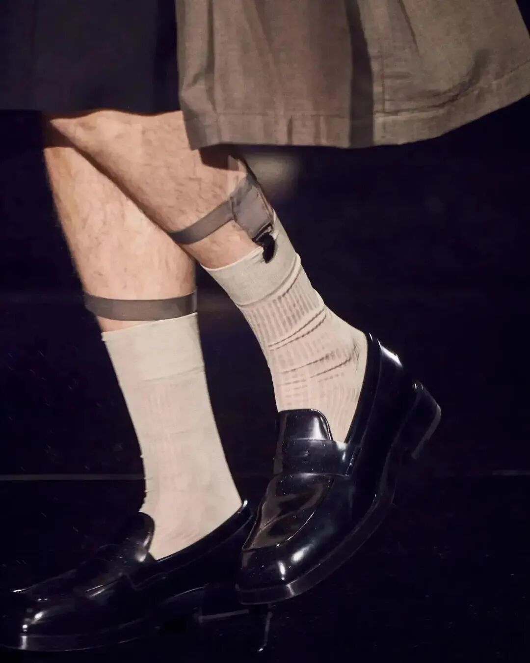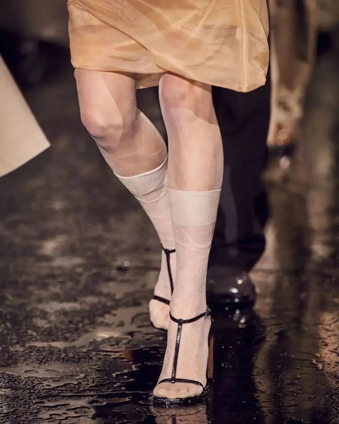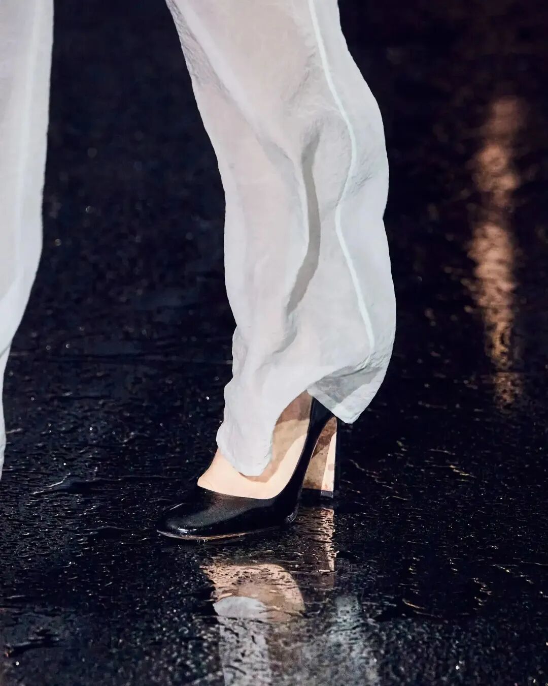 模特們身著正裝穿行於秀場,似在流動的液麵之上翩然起步,同時,透明的絲襪與內層薄紗上衣的細節隱約浮現,嚴謹的整套裝束和略微性感的細節,如同都市生活的縮影和男女情感關係的隱性外化,造就了日常生活中的都市群像。