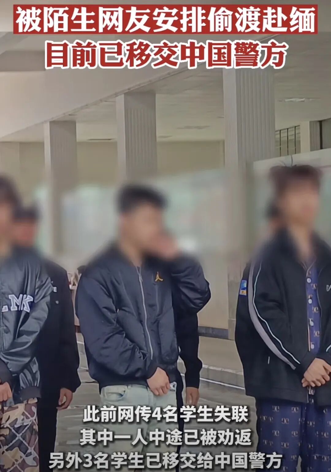 多家媒體報道,安徽合肥某職校4名學生偷渡前往緬甸後失聯。3月20日,緬甸方面表示,接到中國警方的協查通報是3名學生失聯,3月20日下午已將3名學生通過口岸移交給中國警方。記者瞭解到,四名學生中,另一人中途已被勸返。緬甸佤邦一位知情人介紹,詢問得知,此3人是被網友引誘從西雙版納偷渡到緬甸。